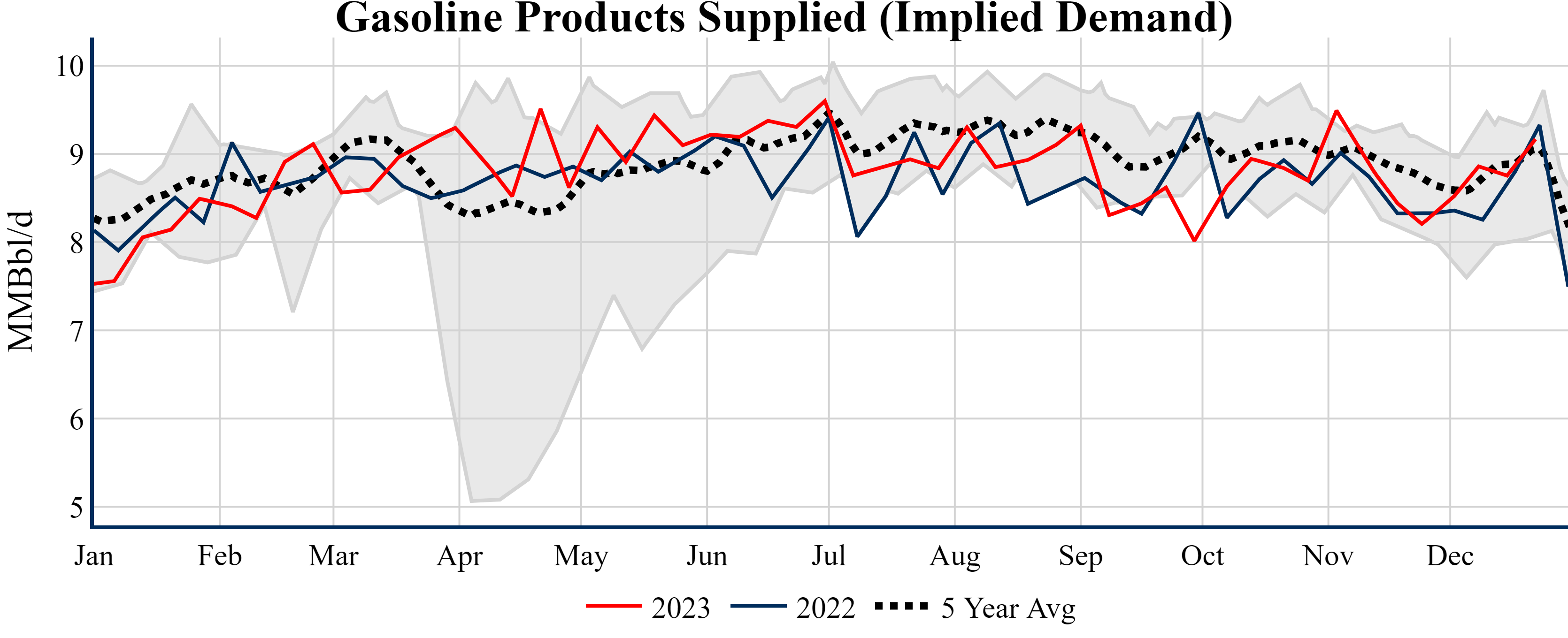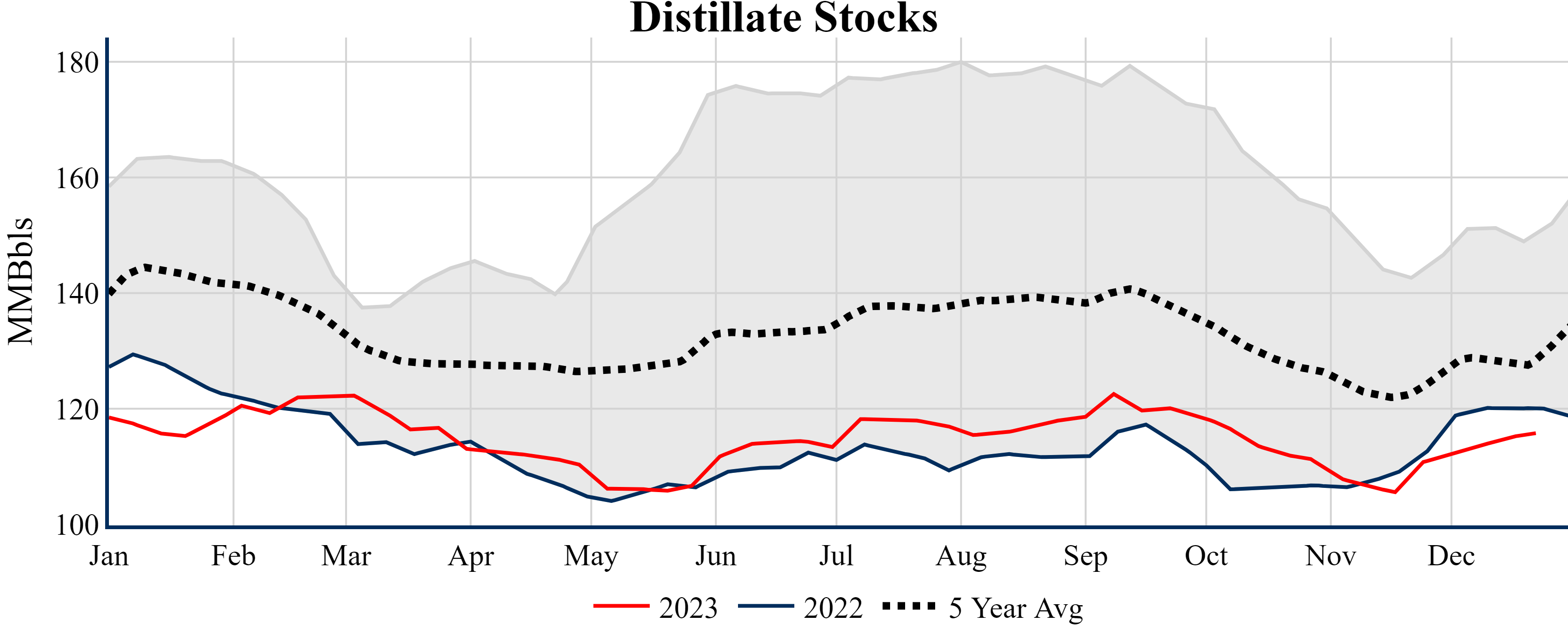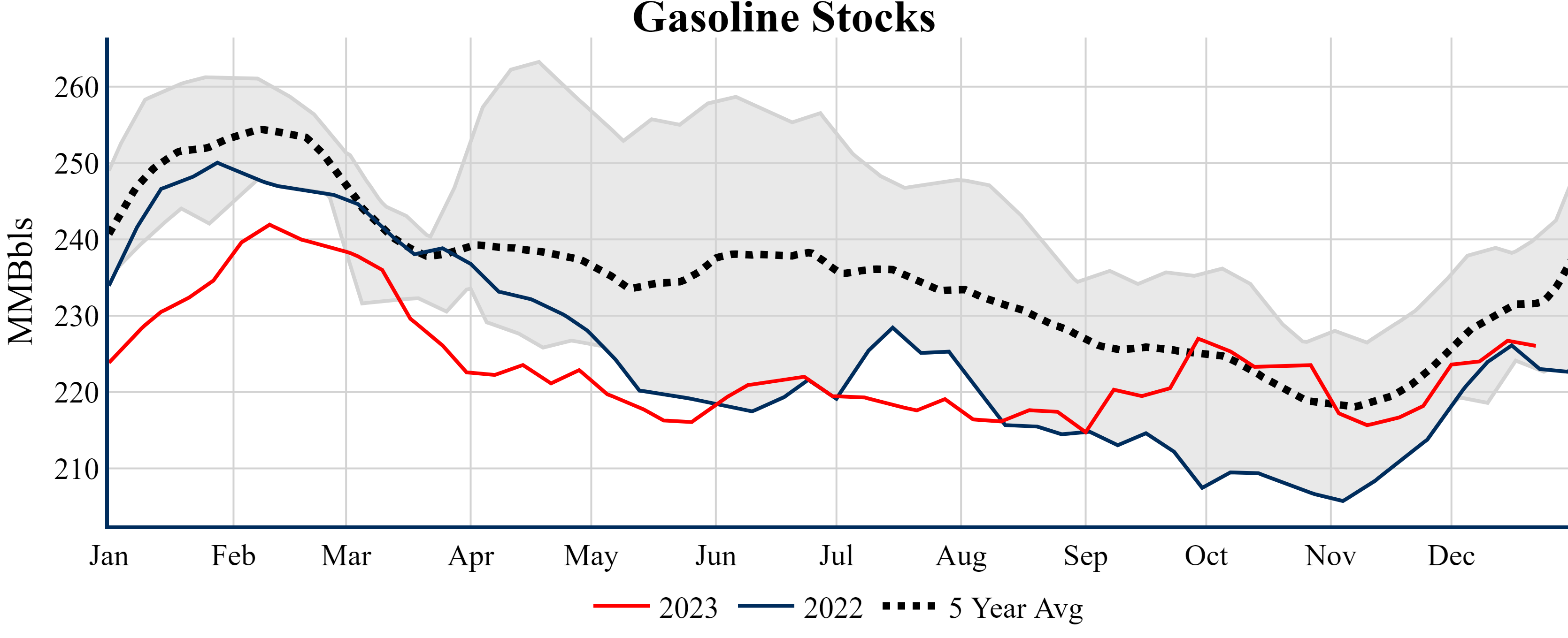 Inventories for the U.S. are now at a surplus of 17.70 MMBbls (4.2%) to last year, and a deficit of 6.70 MMBbls (-1.5%) to the five-year average.