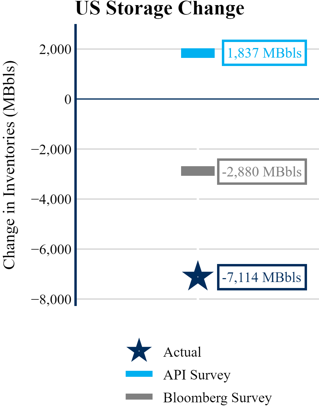 The EIA reported a draw of -7,114 MBbls in U.S. crude-oil inventories. The draw was larger than the average estimate of -7,114 as reported by Bloomberg.