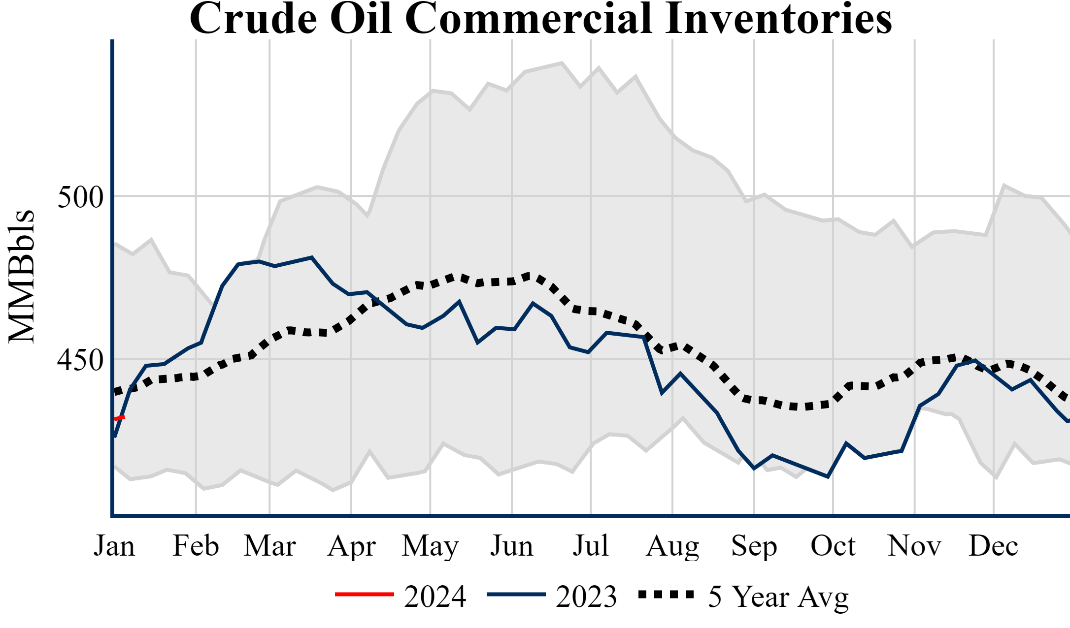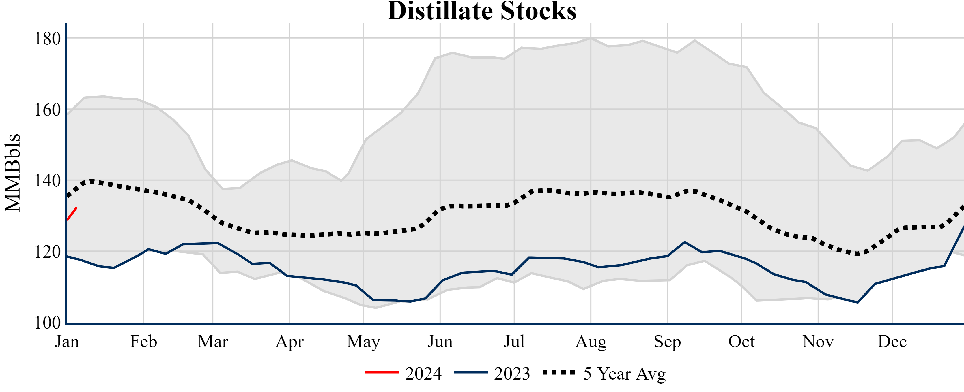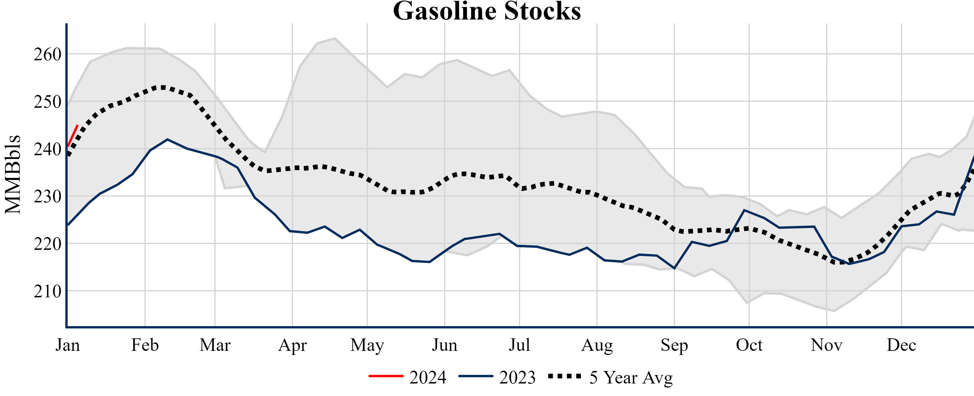 Inventories for the U.S. are now at a deficit of 4.50 MMBbls (-1.0%) to last year, and a deficit of 8.60 MMBbls (-1.9%) to the five-year average.