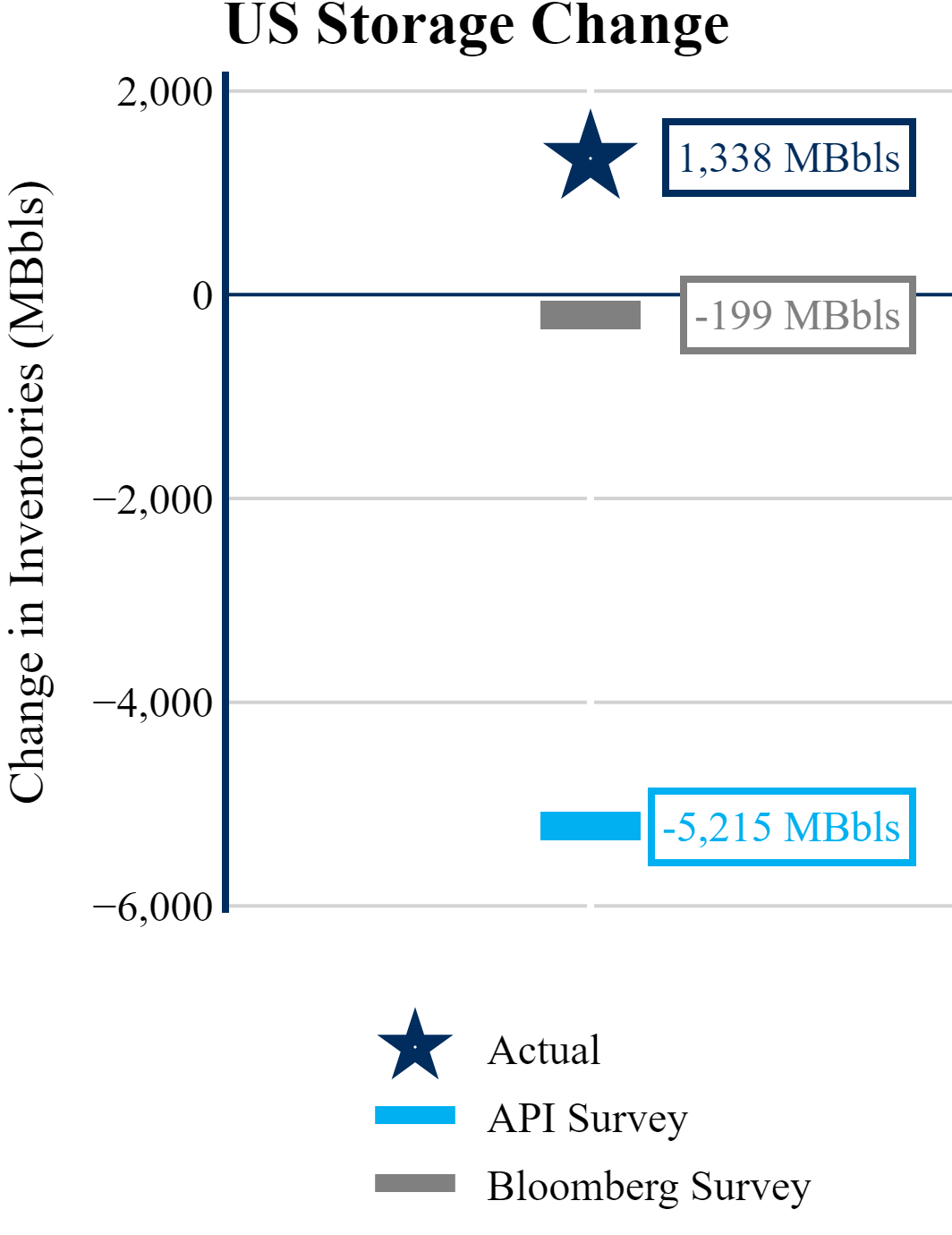 The EIA reported a build of +1,338 MBbls in U.S. crude-oil inventories. In contrast, the market expected a draw of -199 MBbls as reported by Bloomberg.