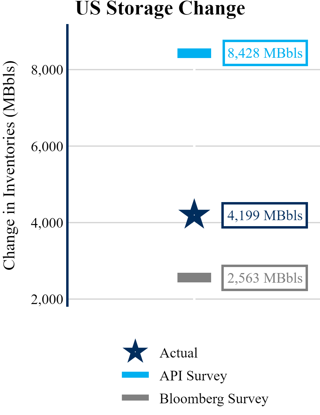 The EIA reported a build of +4,199 MBbls in U.S. crude-oil inventories. The build was larger than the average estimate of +2,563 as reported by Bloomberg.