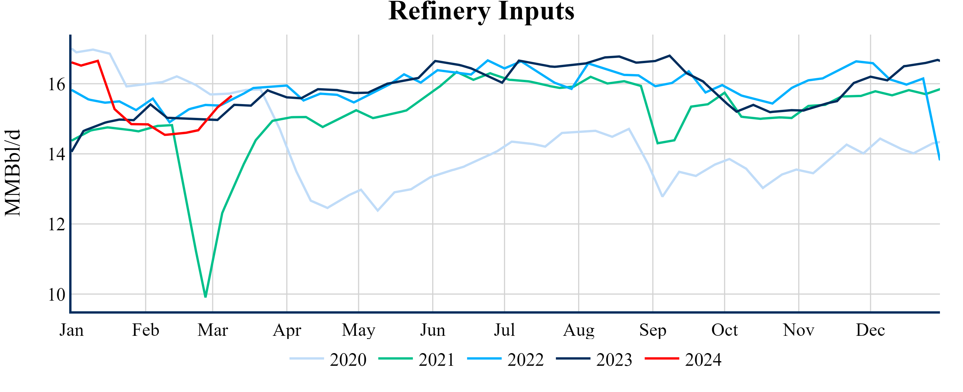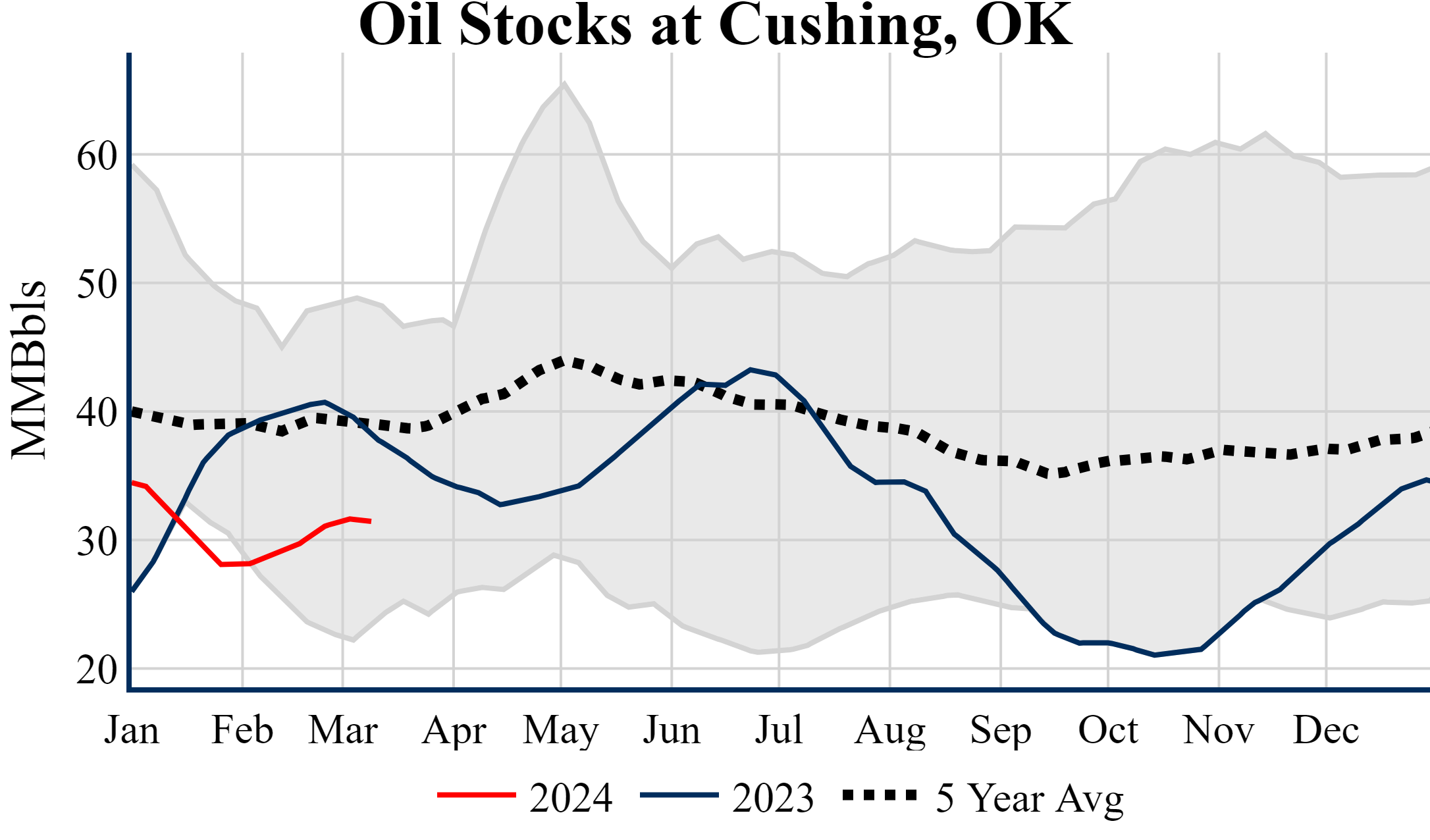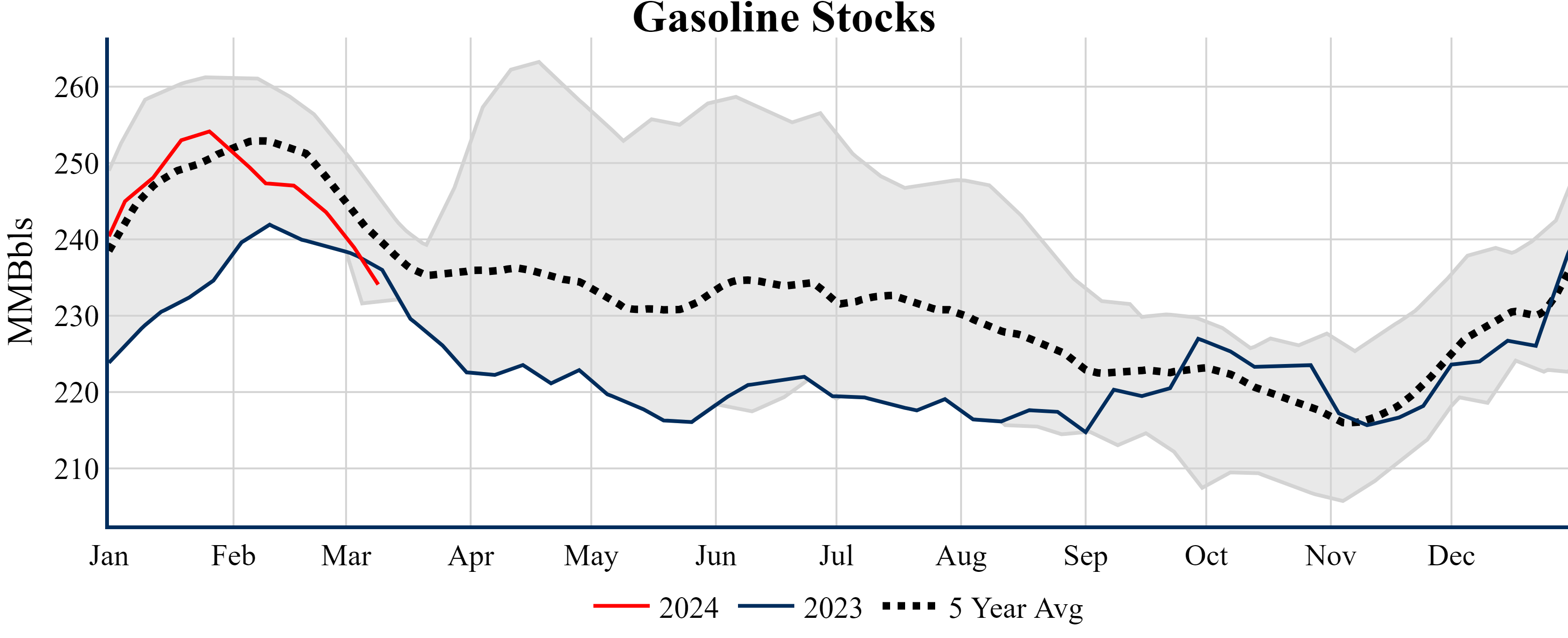 Inventories for the U.S. are now at a deficit of 32.80 MMBbls (-6.8%) to last year, and a deficit of 11.90 MMBbls (-2.6%) to the five-year average.