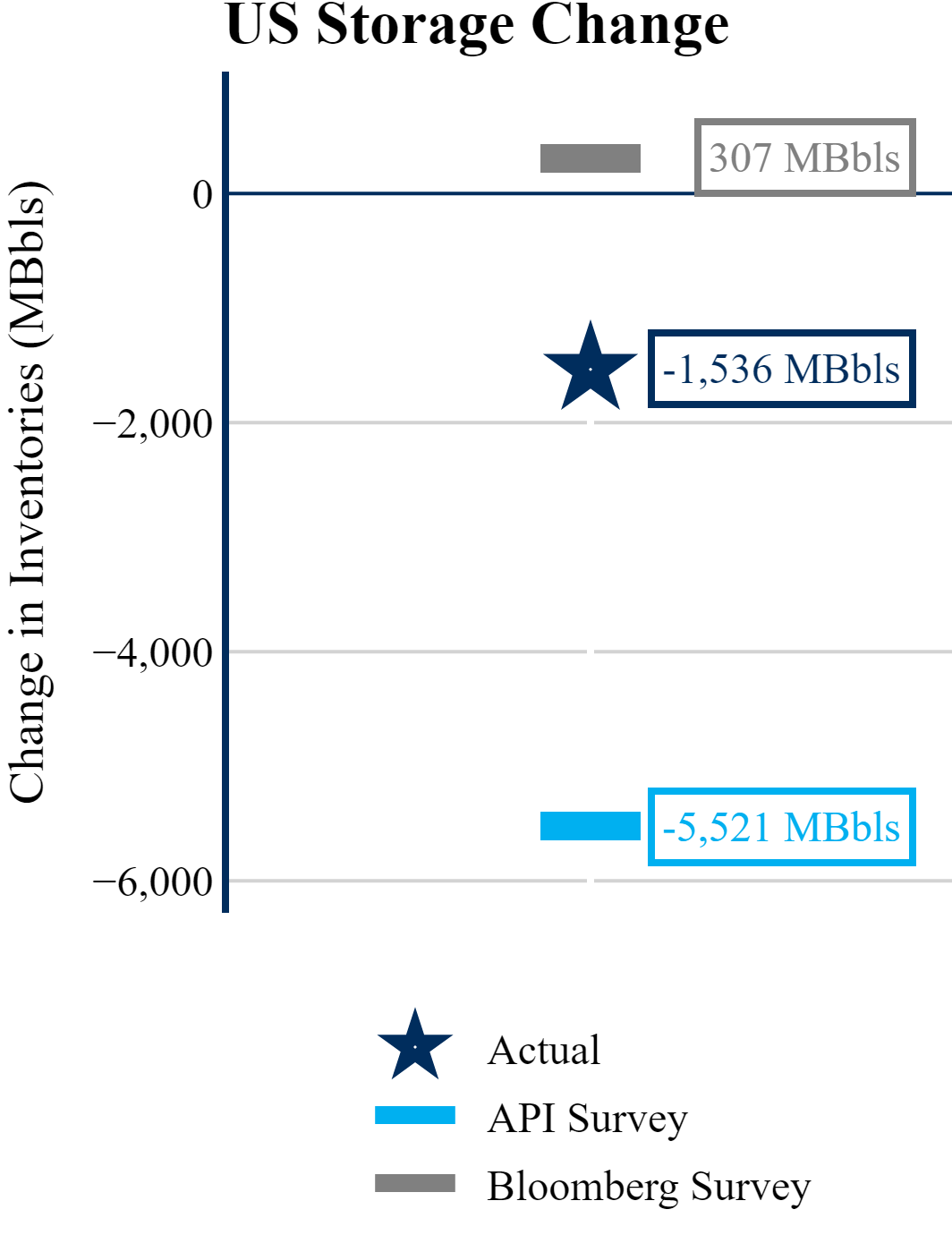 The EIA reported a draw of -1,536 MBbls in U.S. crude-oil inventories. In contrast, the market expected a build of +307 MBbls as reported by Bloomberg.