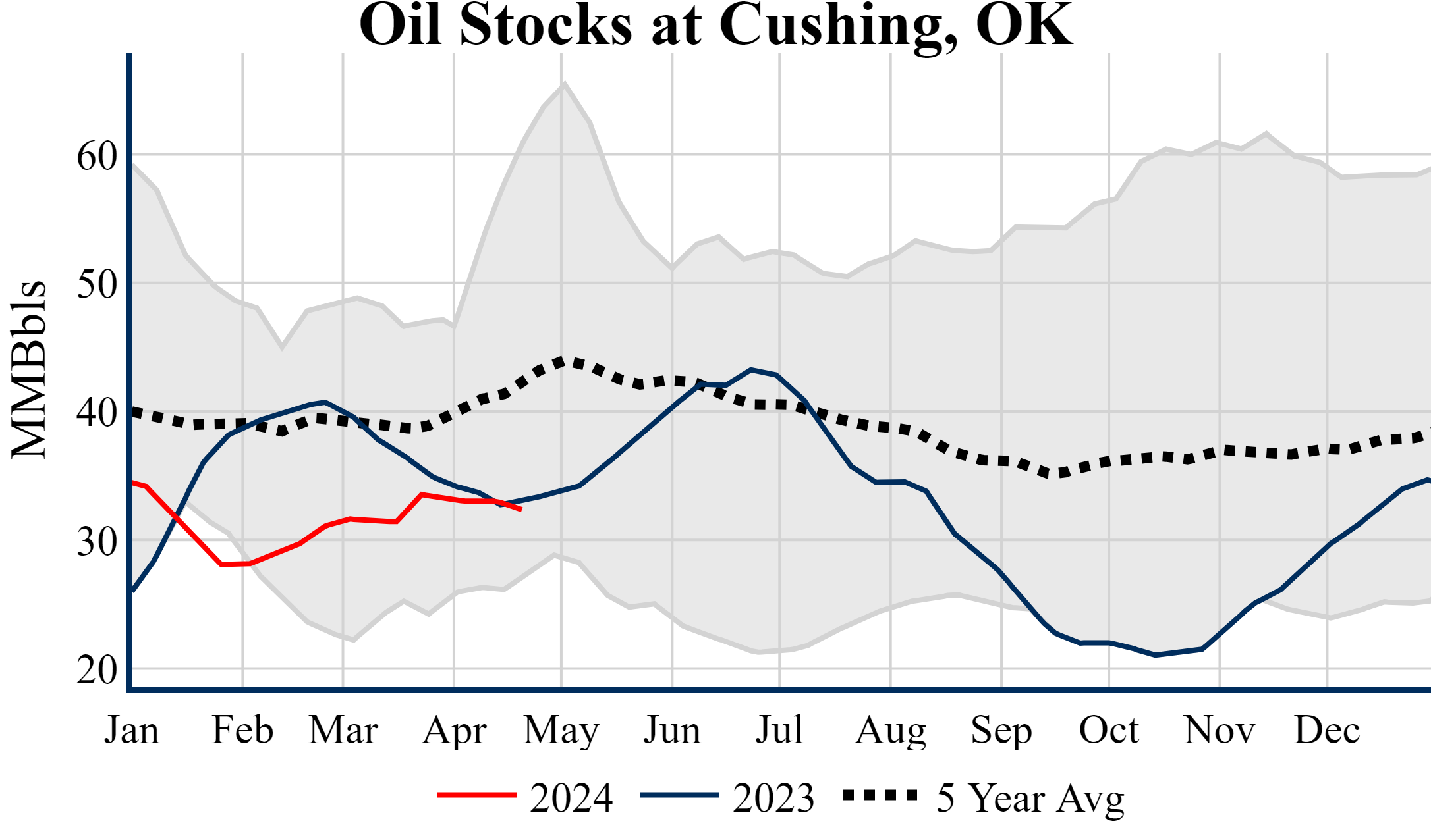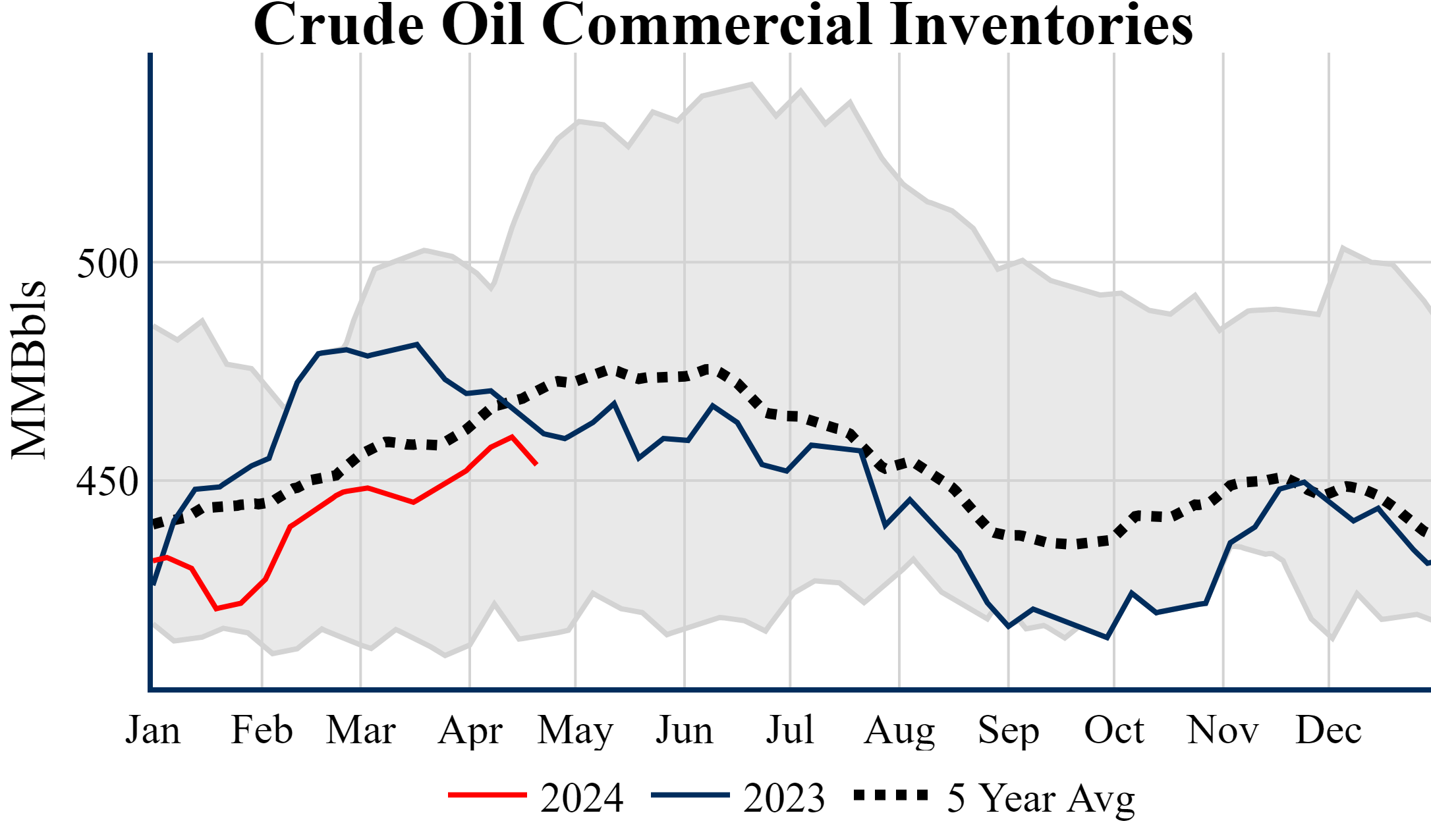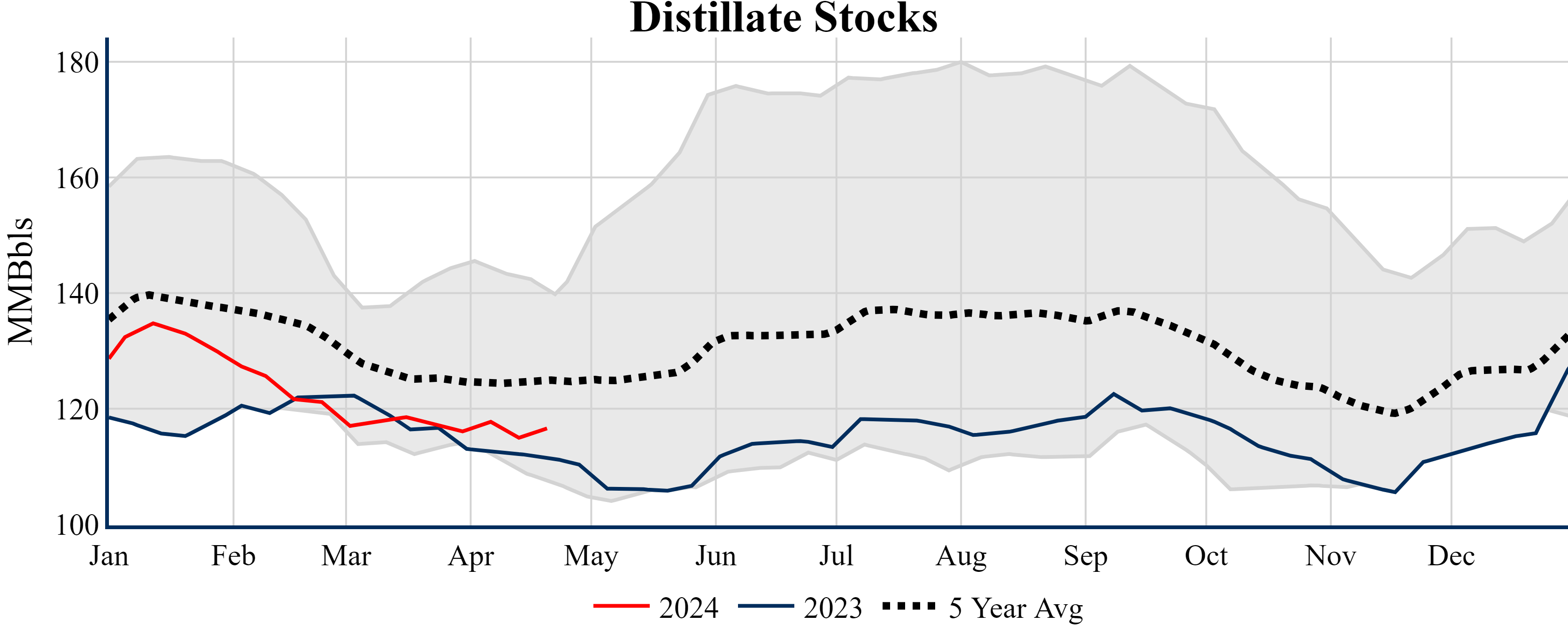 Inventories for the U.S. are now at a deficit of 8.00 MMBbls (-1.7%) to last year, and a deficit of 16.80 MMBbls (-3.6%) to the five-year average.