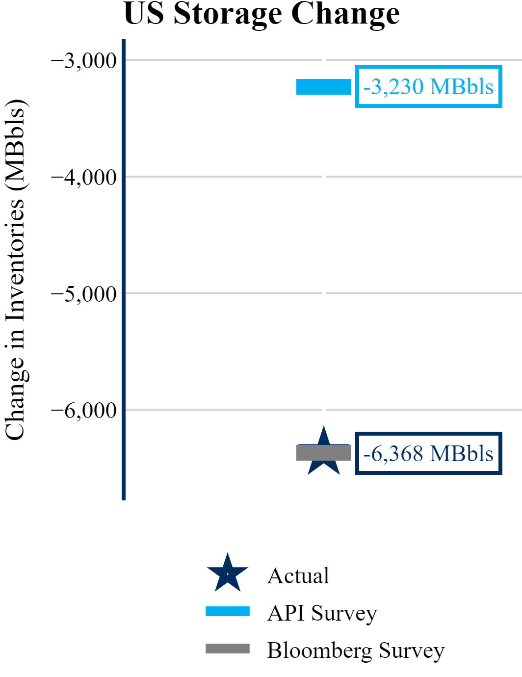 The EIA reported a draw of -6,368 MBbls in U.S. crude-oil inventories. In contrast, the market expected a build of +1,314 MBbls as reported by Bloomberg.