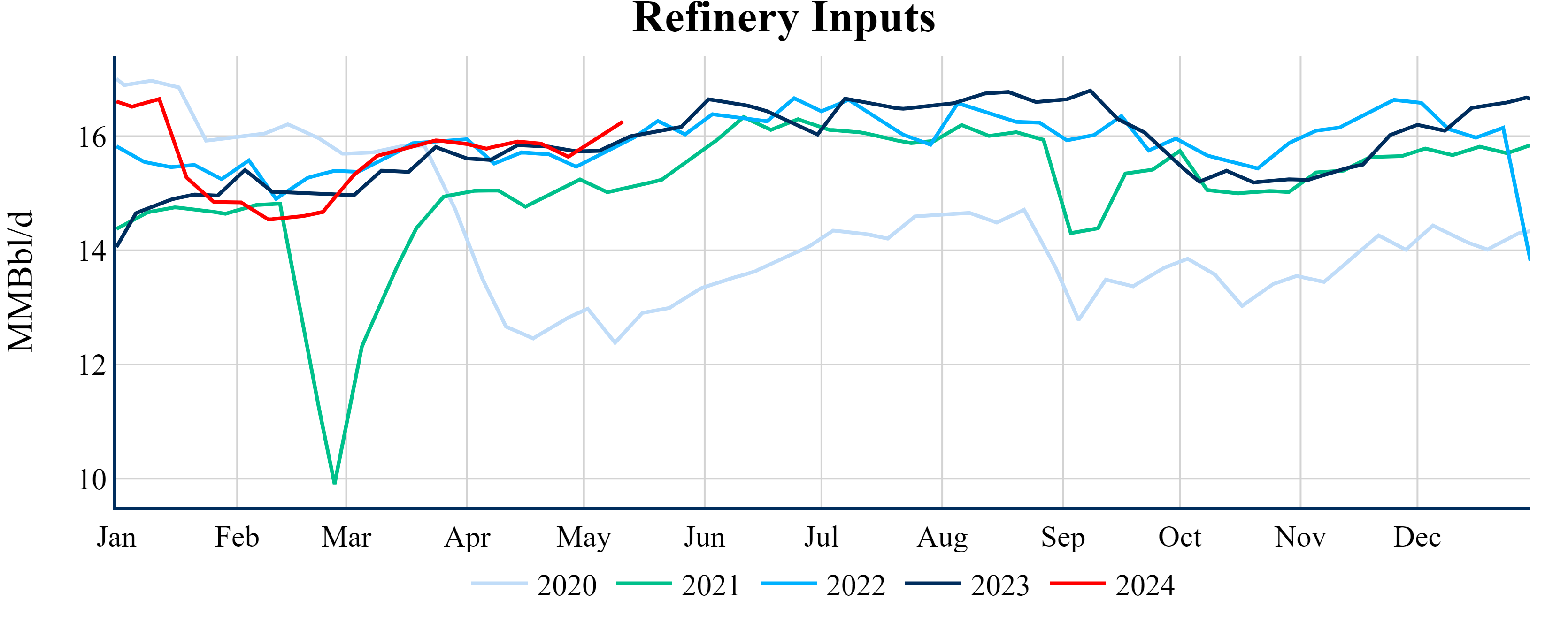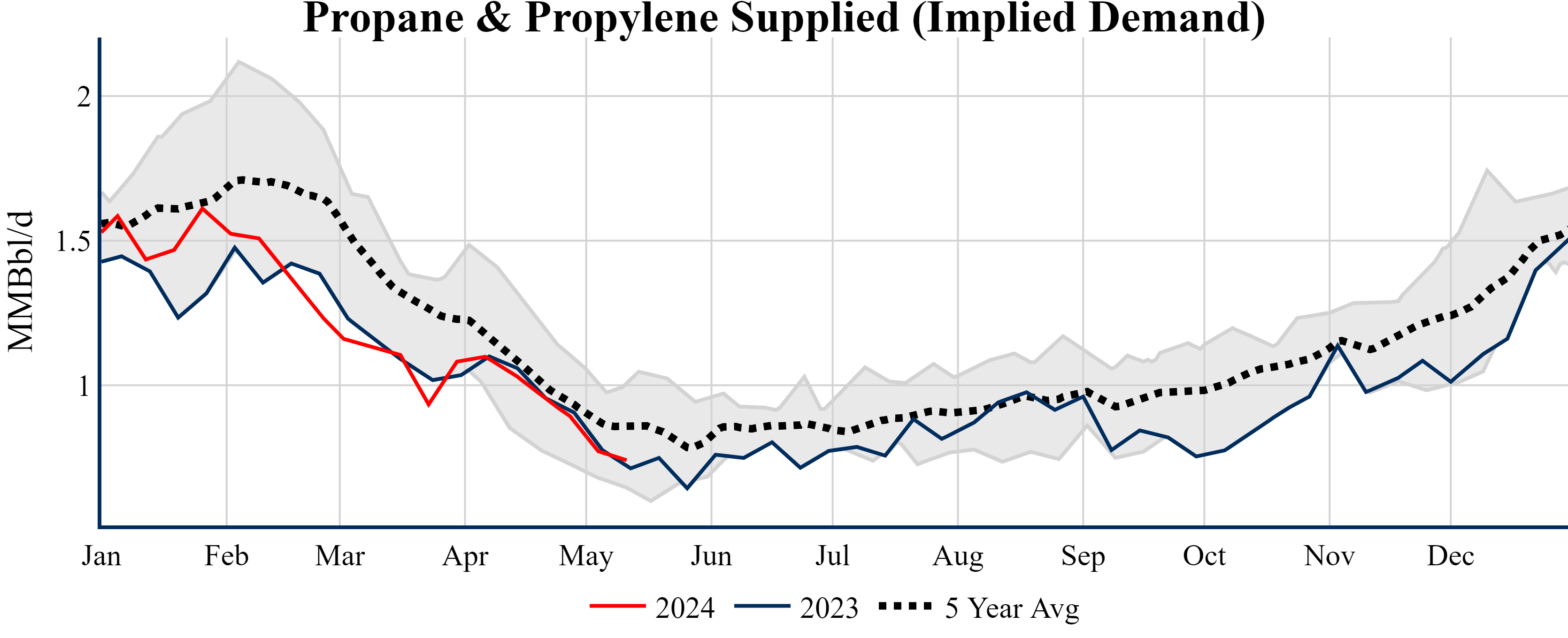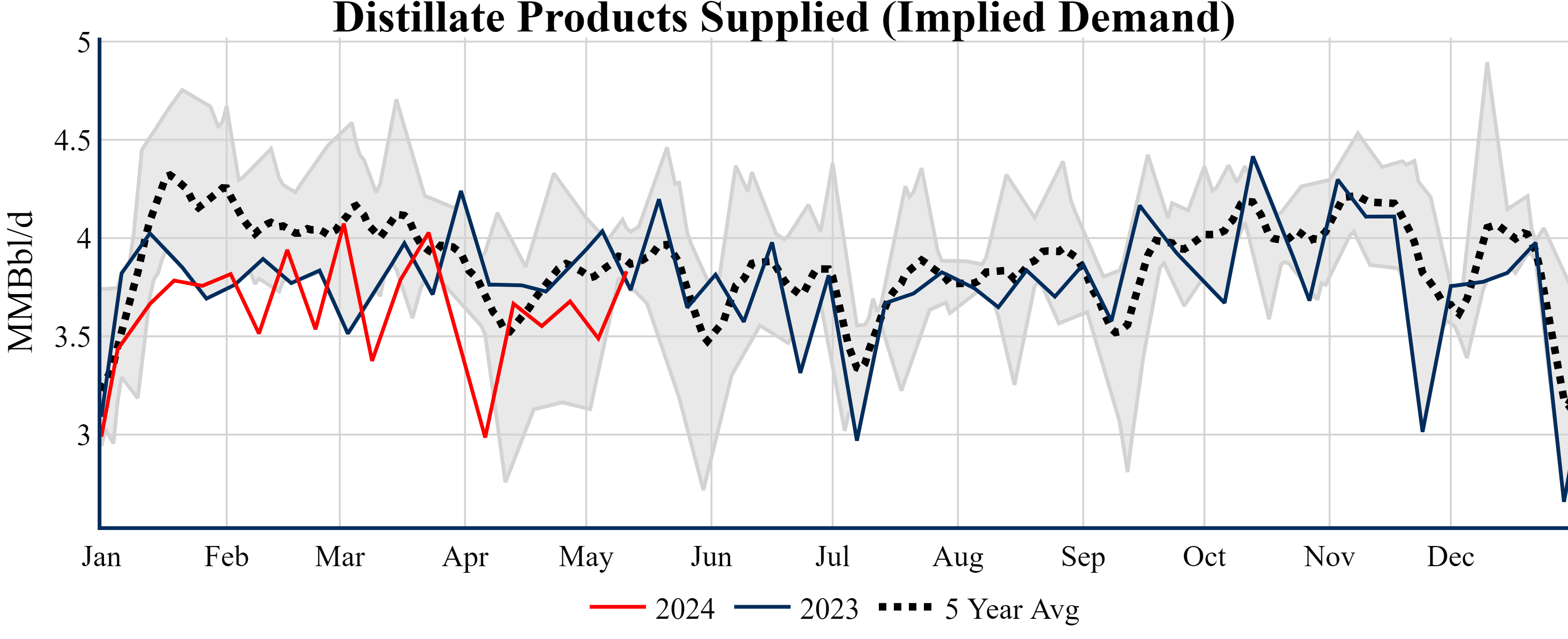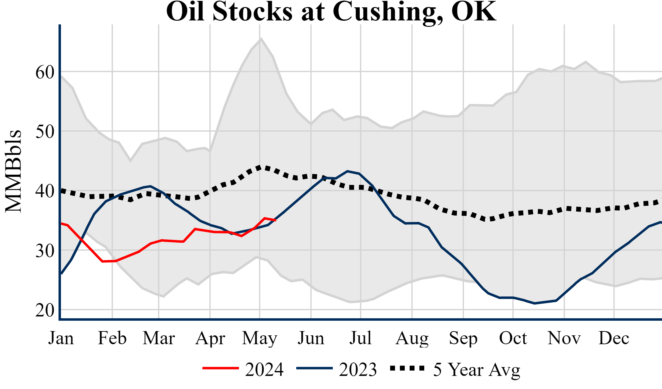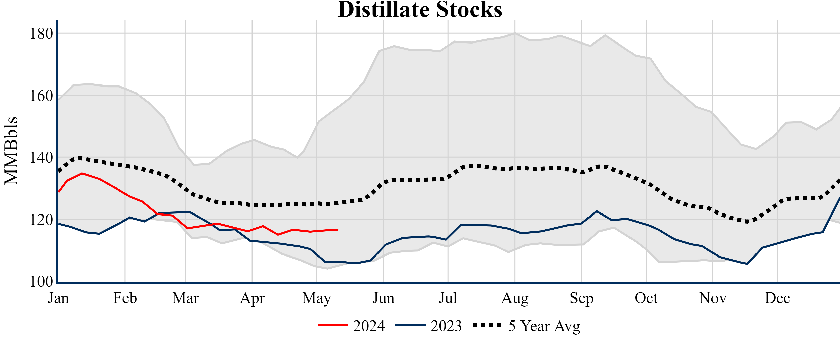 Inventories for the U.S. are now at a deficit of 9.90 MMBbls (-2.1%) to last year, and a deficit of 18.40 MMBbls (-3.9%) to the five-year average.