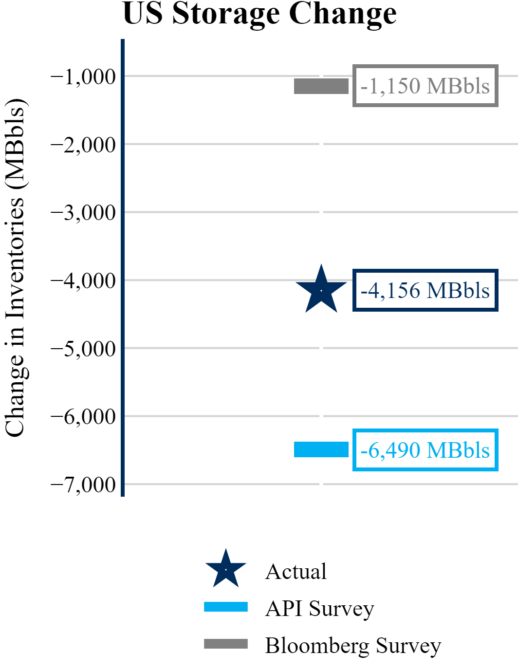 The EIA reported a draw of -4,156 MBbls in U.S. crude-oil inventories. The draw was larger than the average estimate of -1,150 as reported by Bloomberg.