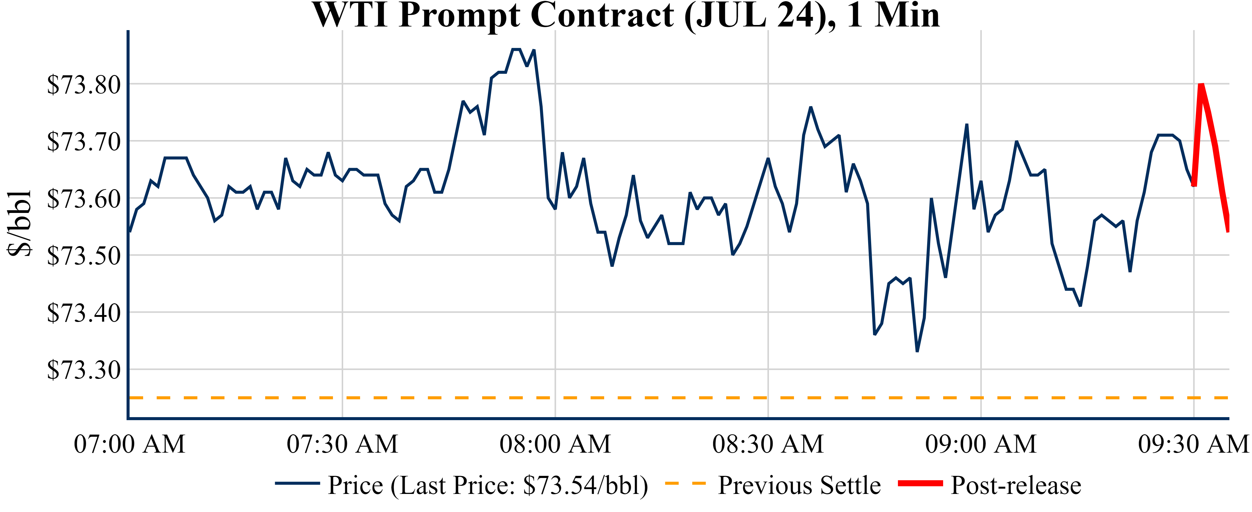 Prices were down in the five minutes following the announcement, to $73.54 from $73.62 just before 09:30 AM.