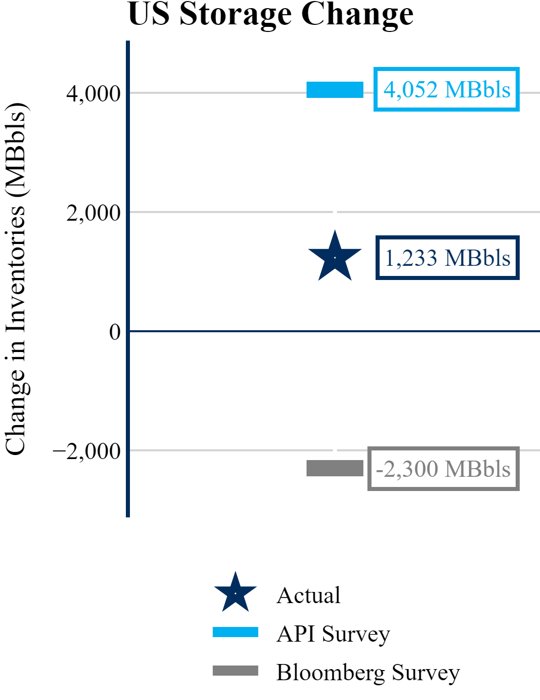 The EIA reported a build of +1,233 MBbls in U.S. crude-oil inventories. In contrast, the market expected a draw of -2,300 MBbls as reported by Bloomberg.