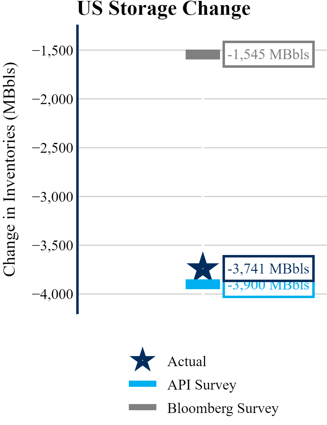 The EIA reported a draw of -3,741 MBbls in U.S. crude-oil inventories. The draw was larger than the average estimate of -1,545 as reported by Bloomberg.