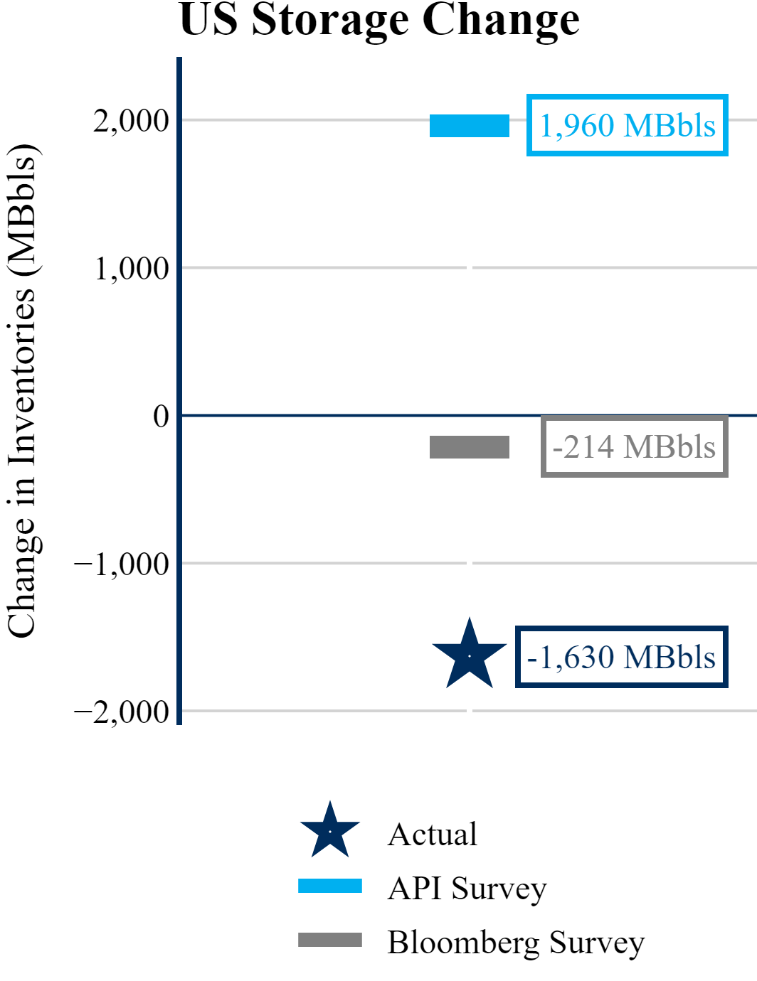 The EIA reported a draw of -1,630 MBbls in U.S. crude-oil inventories. The draw was larger than the average estimate of -214 as reported by Bloomberg.