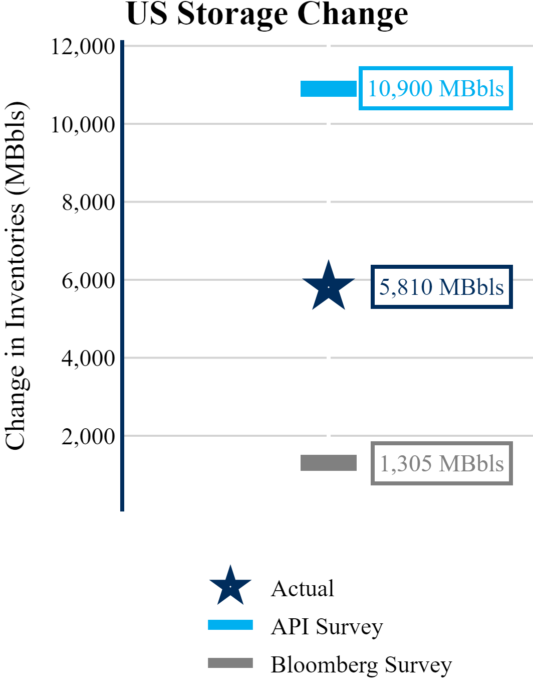 The EIA reported a build of +5,810 MBbls in U.S. crude-oil inventories. In contrast, the market expected a build of 1,305.4 MBbls as reported by Bloomberg.