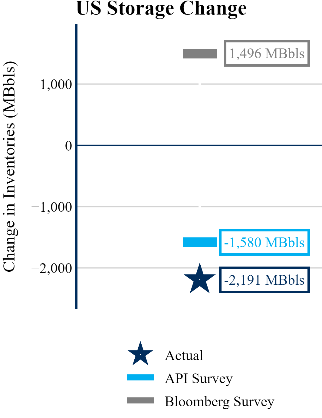 The EIA reported a draw of -2,191 MBbls in U.S. crude-oil inventories. In contrast, the market expected a build of +1,496 MBbls as reported by Bloomberg.