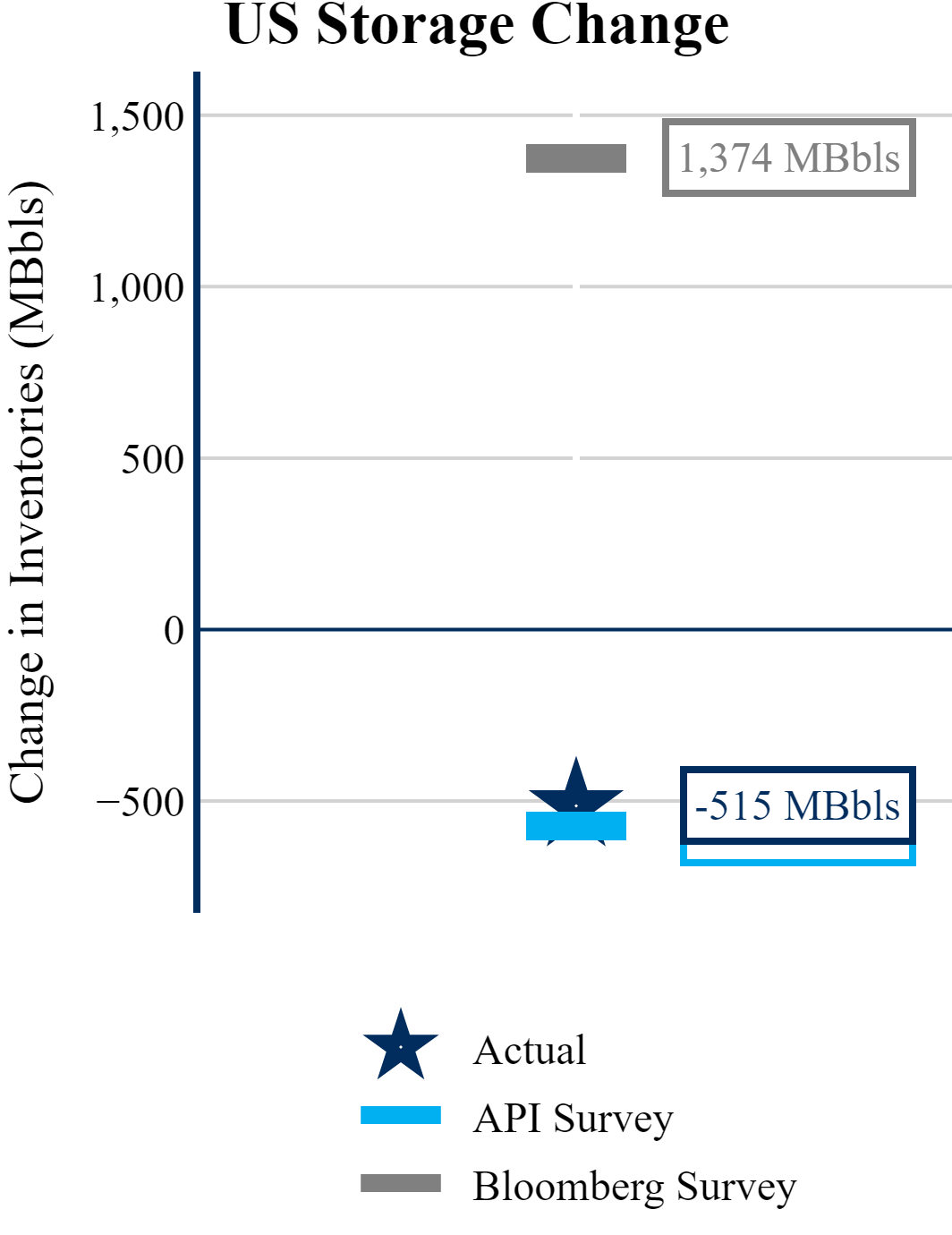 The EIA reported a draw of -515 MBbls in U.S. crude-oil inventories. In contrast, the market expected a build of +1,374 MBbls as reported by Bloomberg.