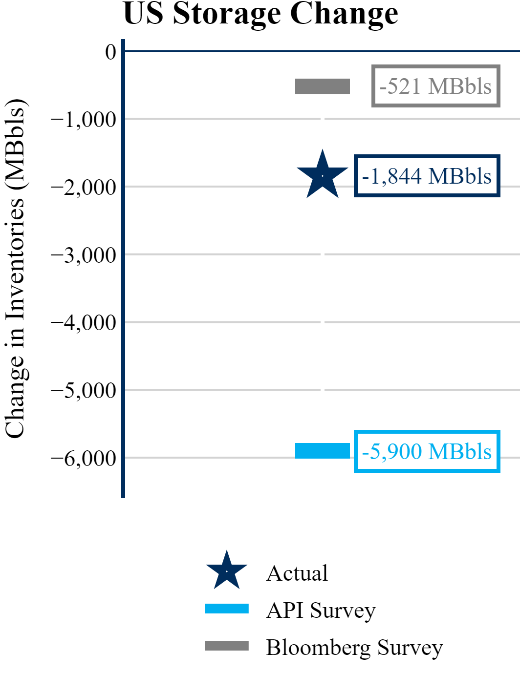 The EIA reported a draw of -1,844 MBbls in U.S. crude-oil inventories. The draw was larger than the average estimate of -521 as reported by Bloomberg.