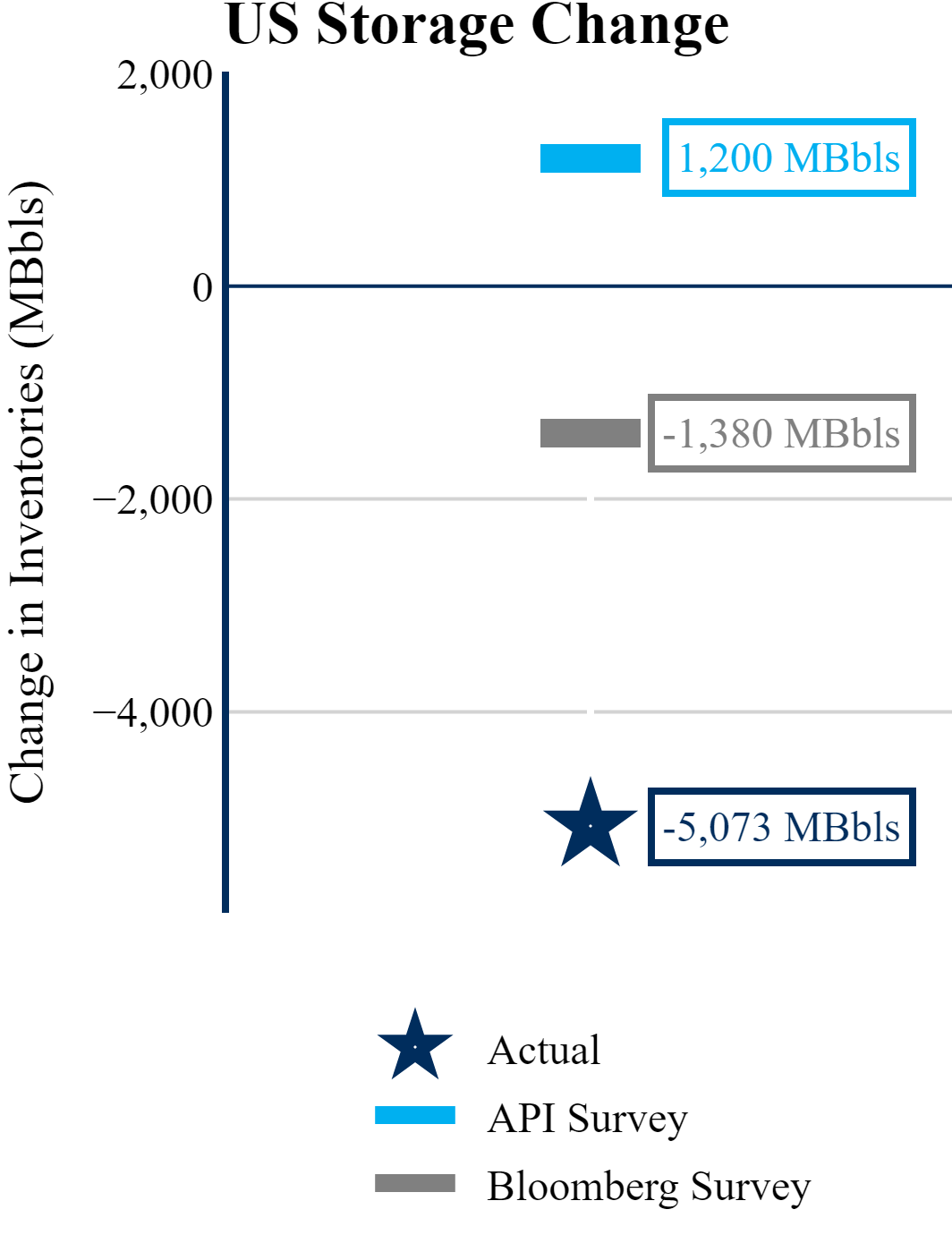 The EIA reported a draw of -5,073 MBbls in U.S. crude-oil inventories. The draw was larger than the average estimate of -1,380 as reported by Bloomberg.