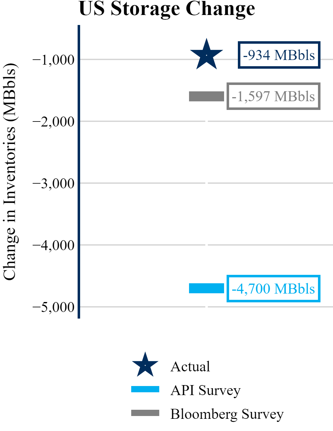 The EIA reported a draw of -934 MBbls in U.S. crude-oil inventories. The draw was smaller than the average estimate of -1,597 as reported by Bloomberg.