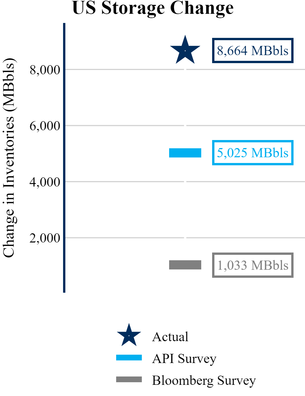 The EIA reported a build of +8,664 MBbls in U.S. crude-oil inventories. The build was larger than the average estimate of +1,033 as reported by Bloomberg.