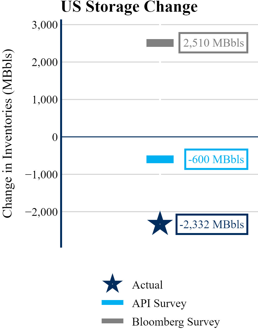 The EIA reported a draw of -2,332 MBbls in U.S. crude-oil inventories. In contrast, the market expected a build of +2,510 MBbls as reported by Bloomberg.