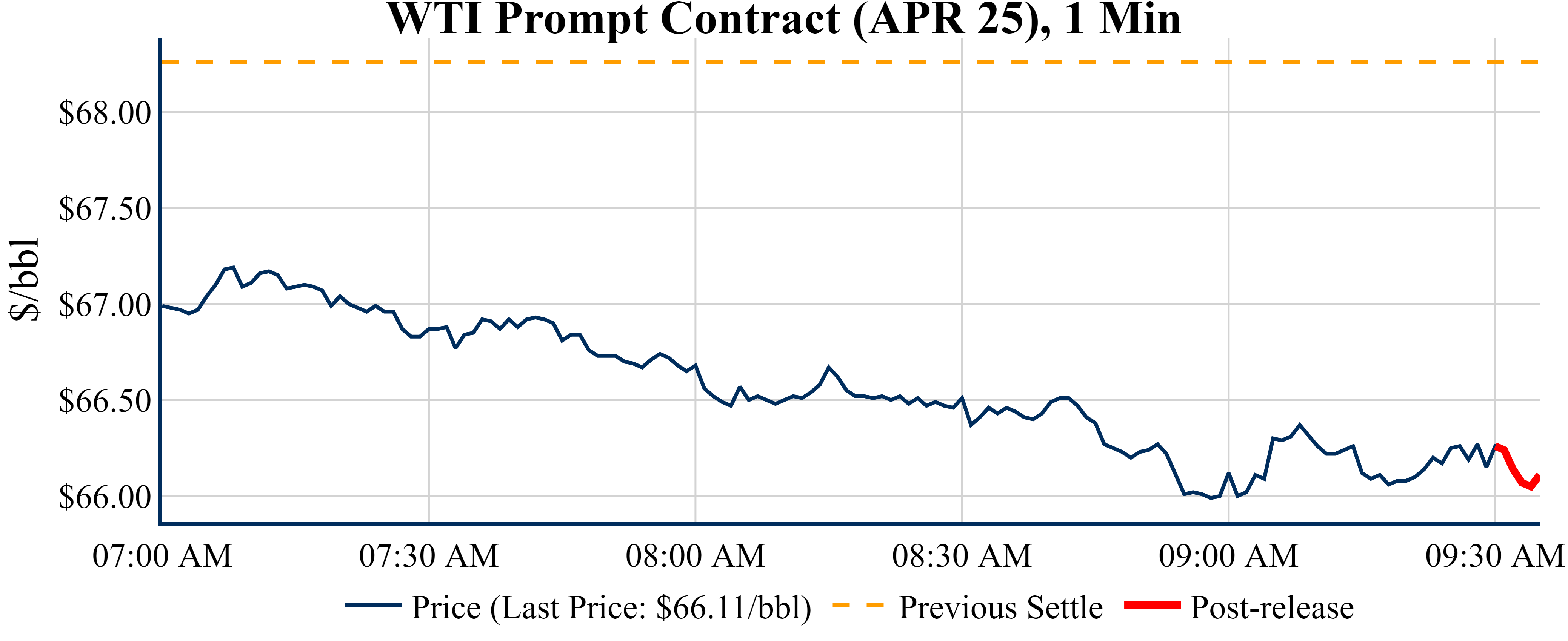 Prices were down in the five minutes following the announcement, to $66.11 from $66.26 just before 09:30 AM.