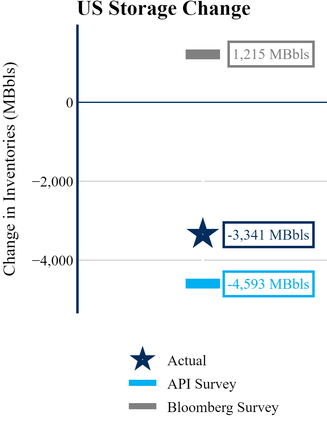 The EIA reported a draw of -3,341 MBbls in U.S. crude-oil inventories. In contrast, the market expected a build of +1,215 MBbls as reported by Bloomberg.