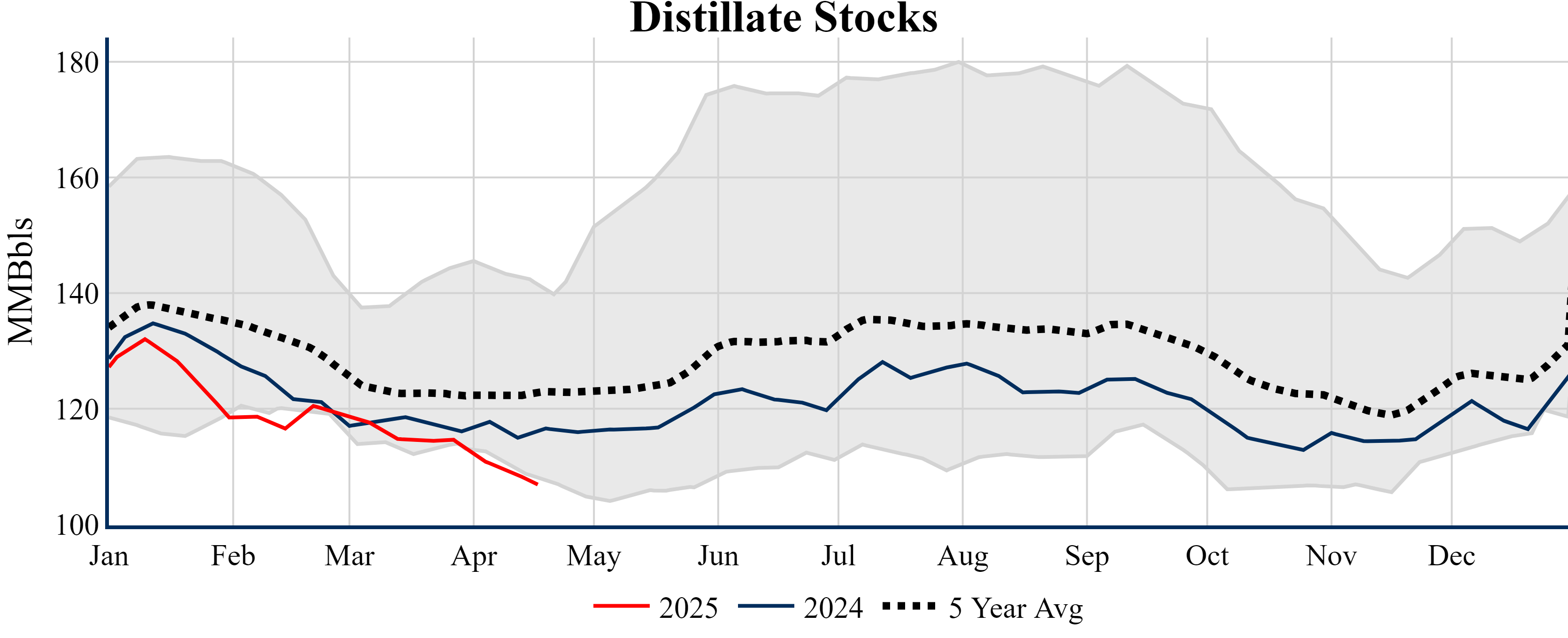 Inventories for the U.S. are now at a deficit of 12.30 MMBbls (-2.7%) to last year, and a deficit of 25.70 MMBbls (-5.5%) to the five-year average.