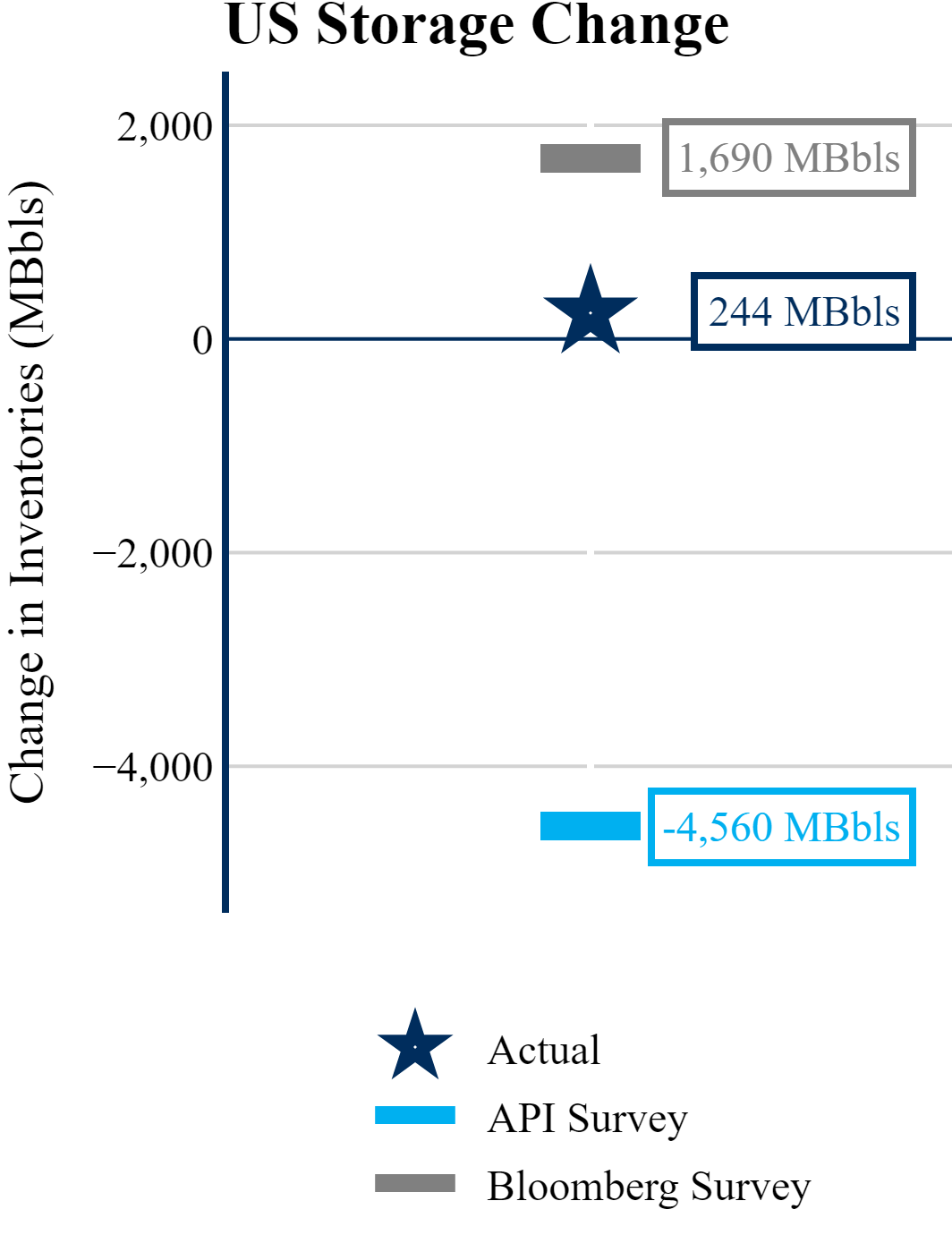 The EIA reported a build of +244 MBbls in U.S. crude-oil inventories. The build was smaller than the average estimate of +1,690 MBbls as reported by Bloomberg.