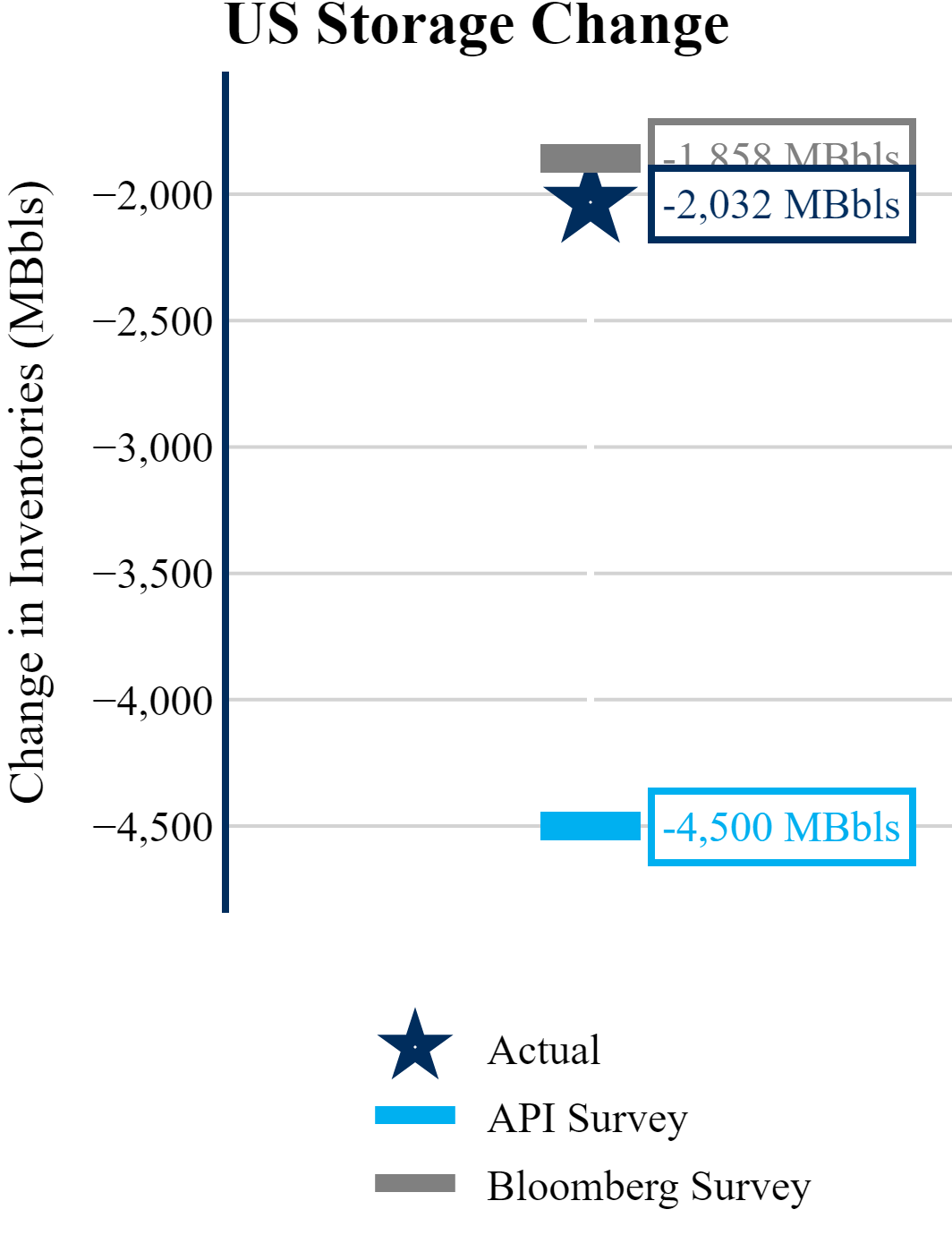 The EIA reported a draw of -2,032 MBbls in U.S. crude-oil inventories. The draw was larger than the average estimate of -1,858 MBbls as reported by Bloomberg.