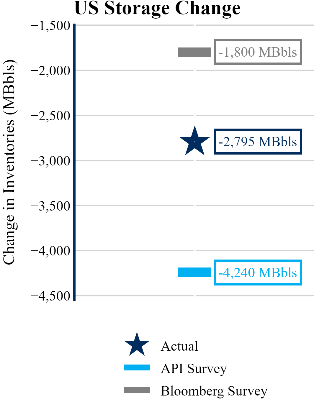 The EIA reported a draw of -2,795 MBbls in U.S. crude-oil inventories. The draw was larger than the average estimate of -1,800 as reported by Bloomberg.