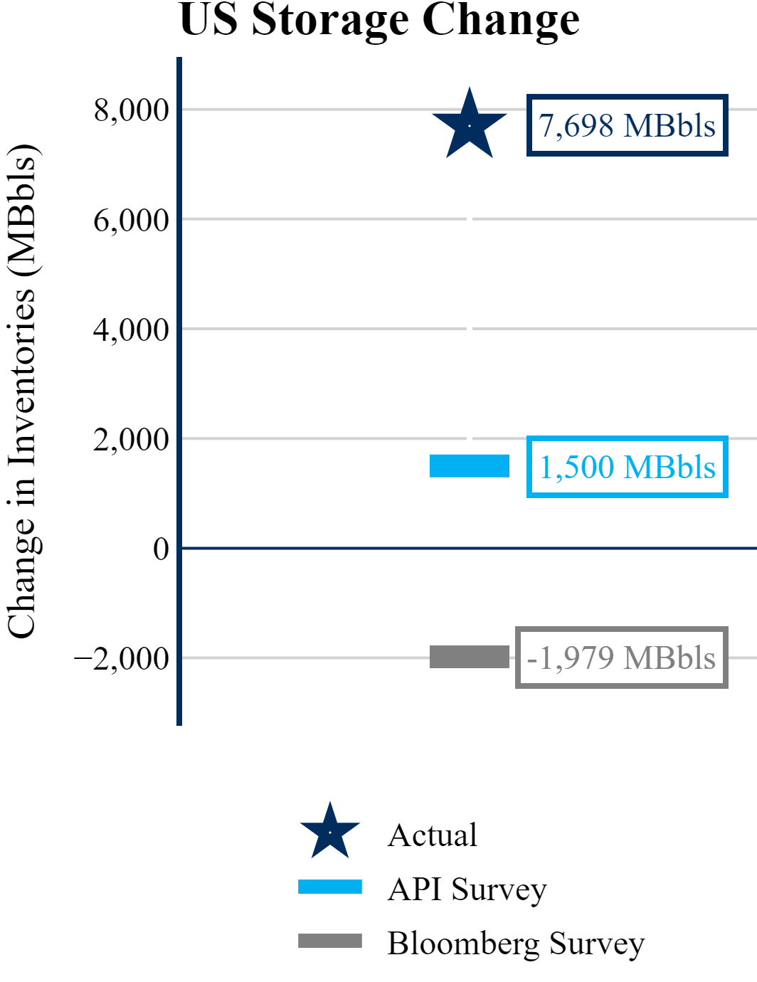 The EIA reported a build of +7,698 MBbls in U.S. crude-oil inventories. In contrast, the market expected a draw of -1,979 MBbls as reported by Bloomberg.