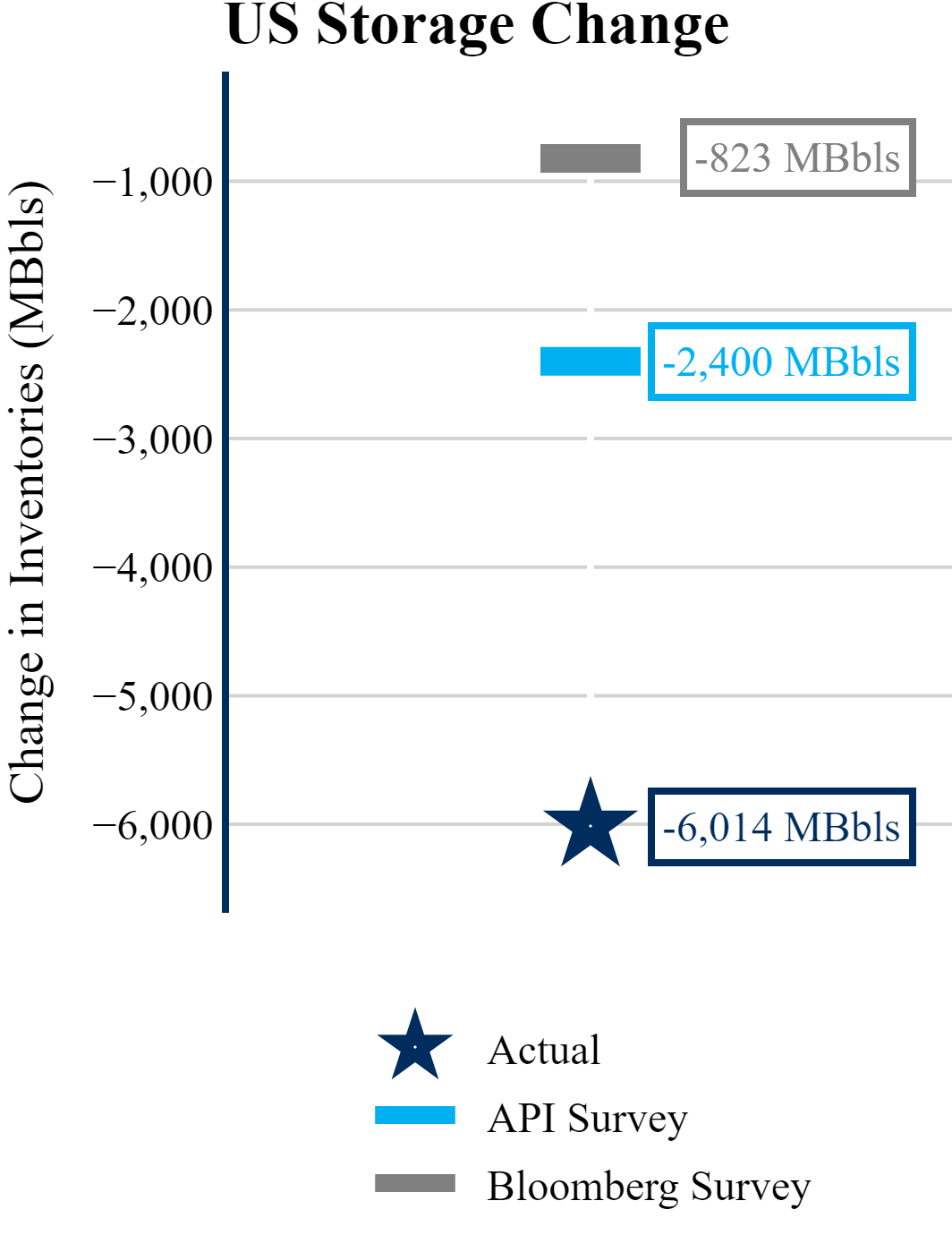 The EIA reported a draw of 6,014 MBbls in U.S. crude-oil inventories. In contrast, the market expected a draw of 823 MBbls as reported by Bloomberg.