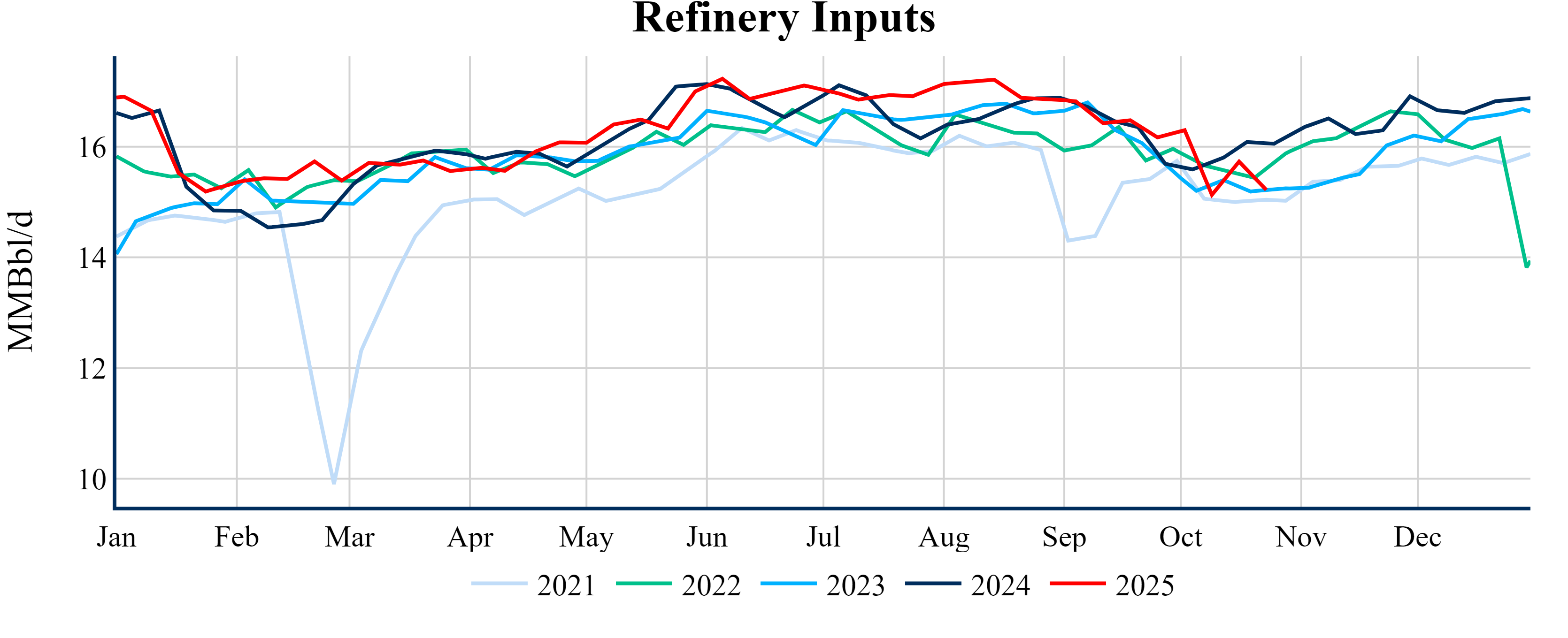 Inventories for the U.S. are now at a deficit of 9.70 MMBbls (-2.3%) to last year, and a deficit of 26.00 MMBbls (-5.9%) to the five-year average.