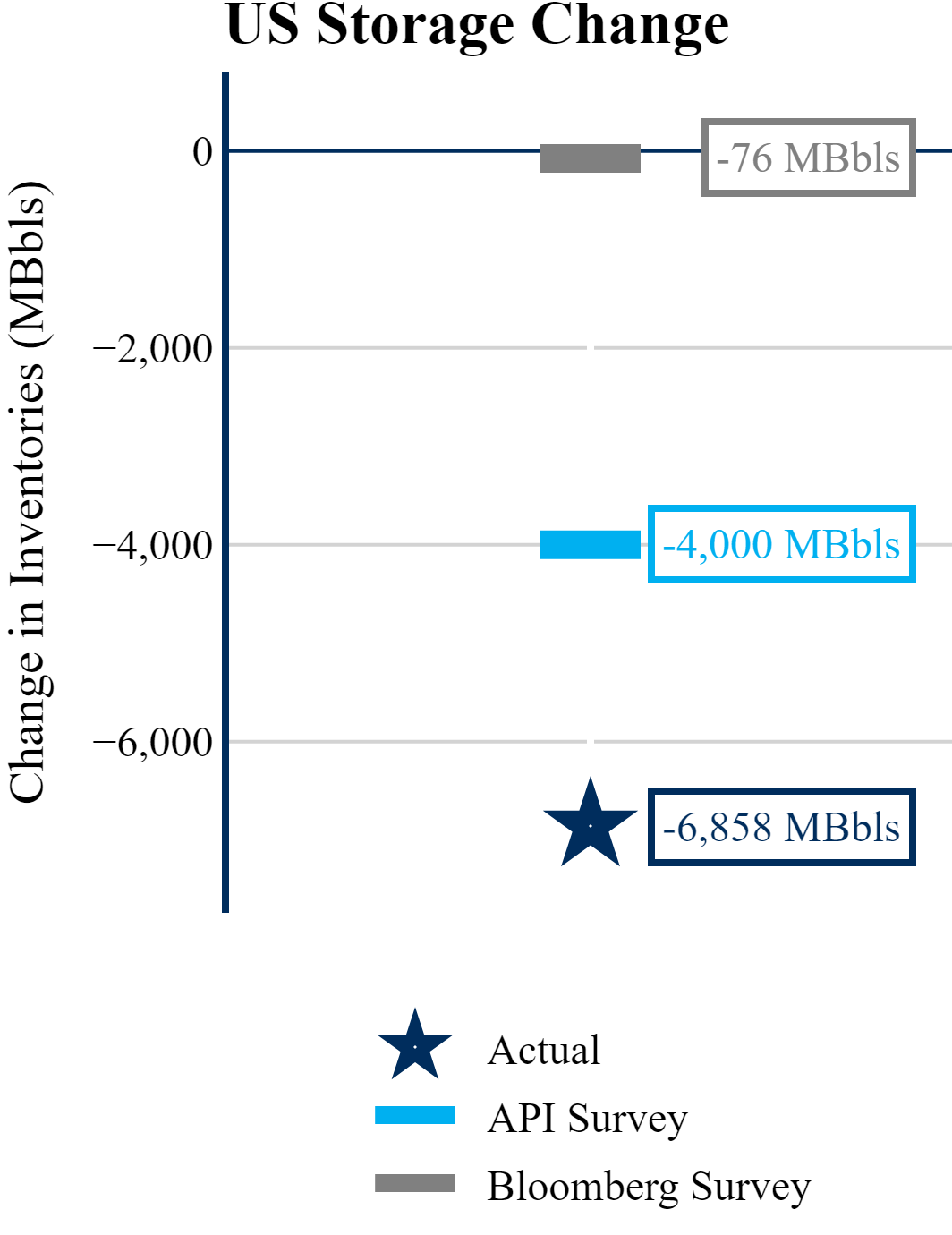 The EIA reported a draw of -6,858 MBbls in U.S. crude-oil inventories. The draw was larger than the average estimate of -76 MBbls as reported by Bloomberg.