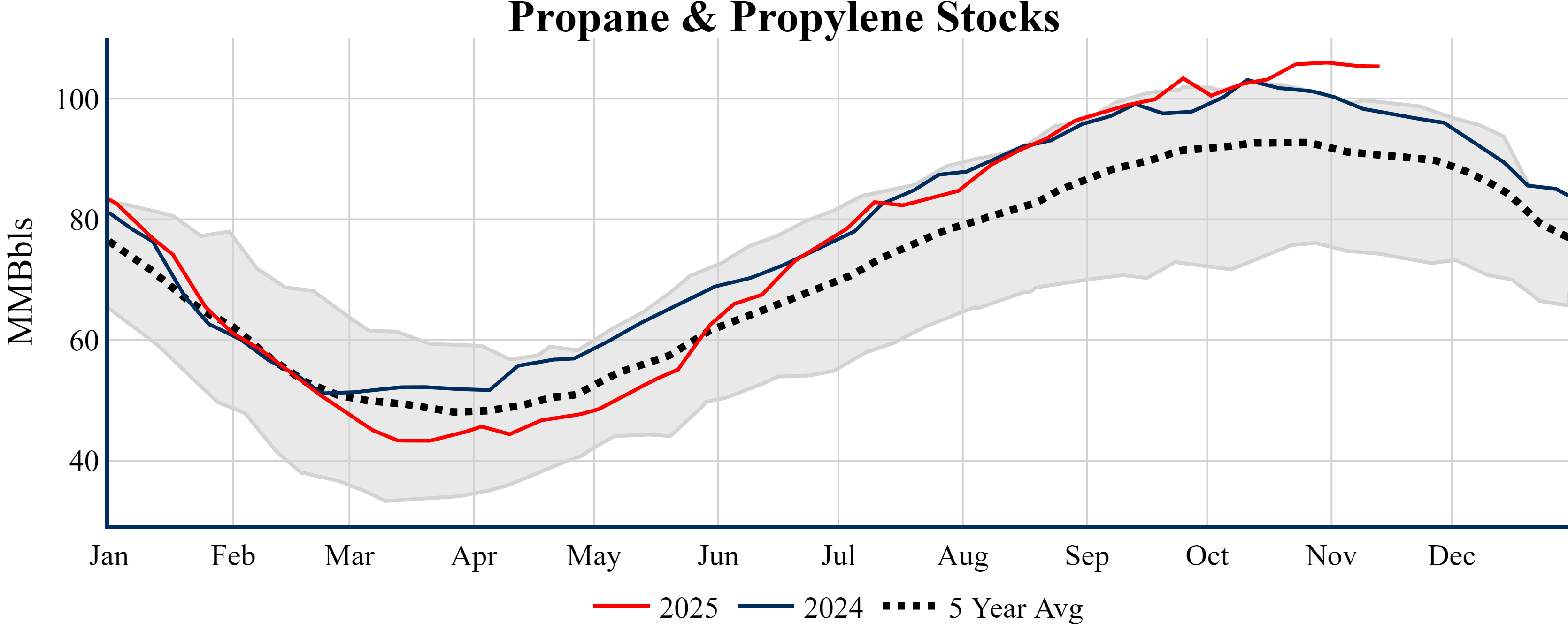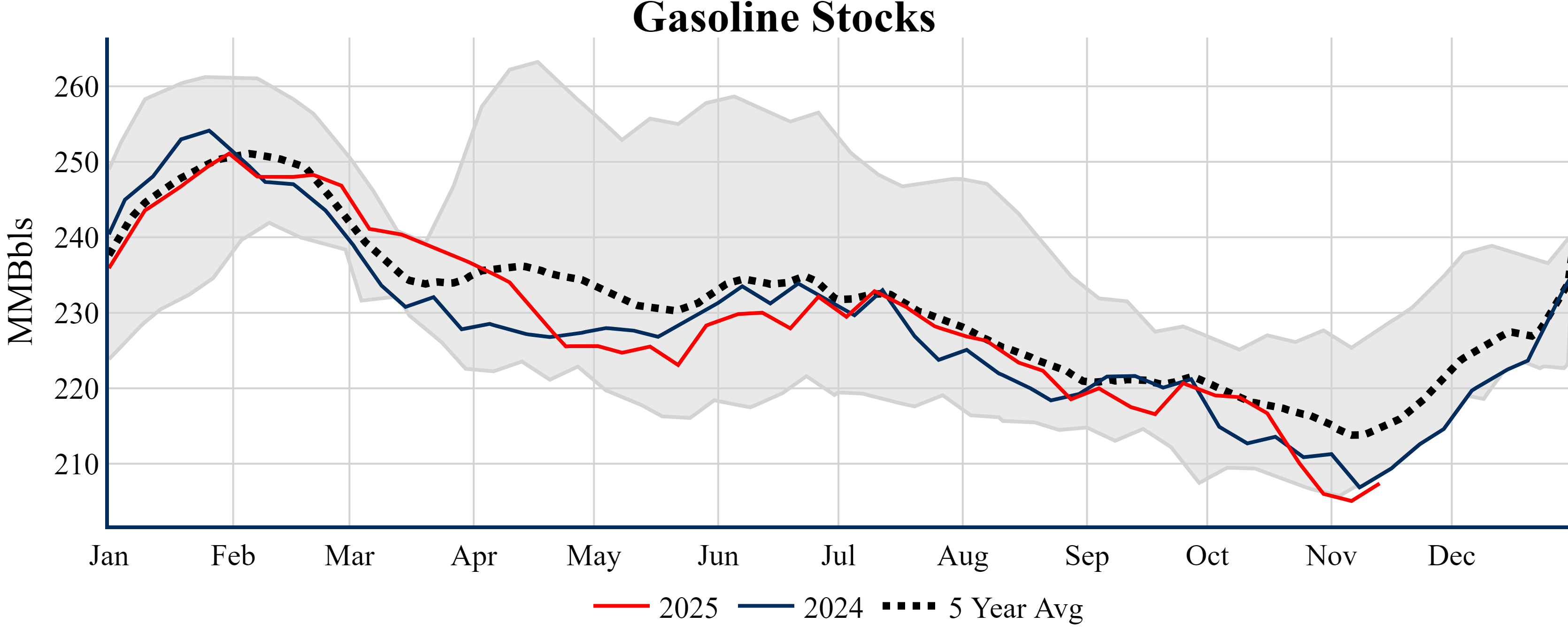 Inventories for the U.S. are now at a deficit of 6.00 MMBbls (-1.4%) to last year, and a deficit of 22.00 MMBbls (-4.9%) to the five-year average.
