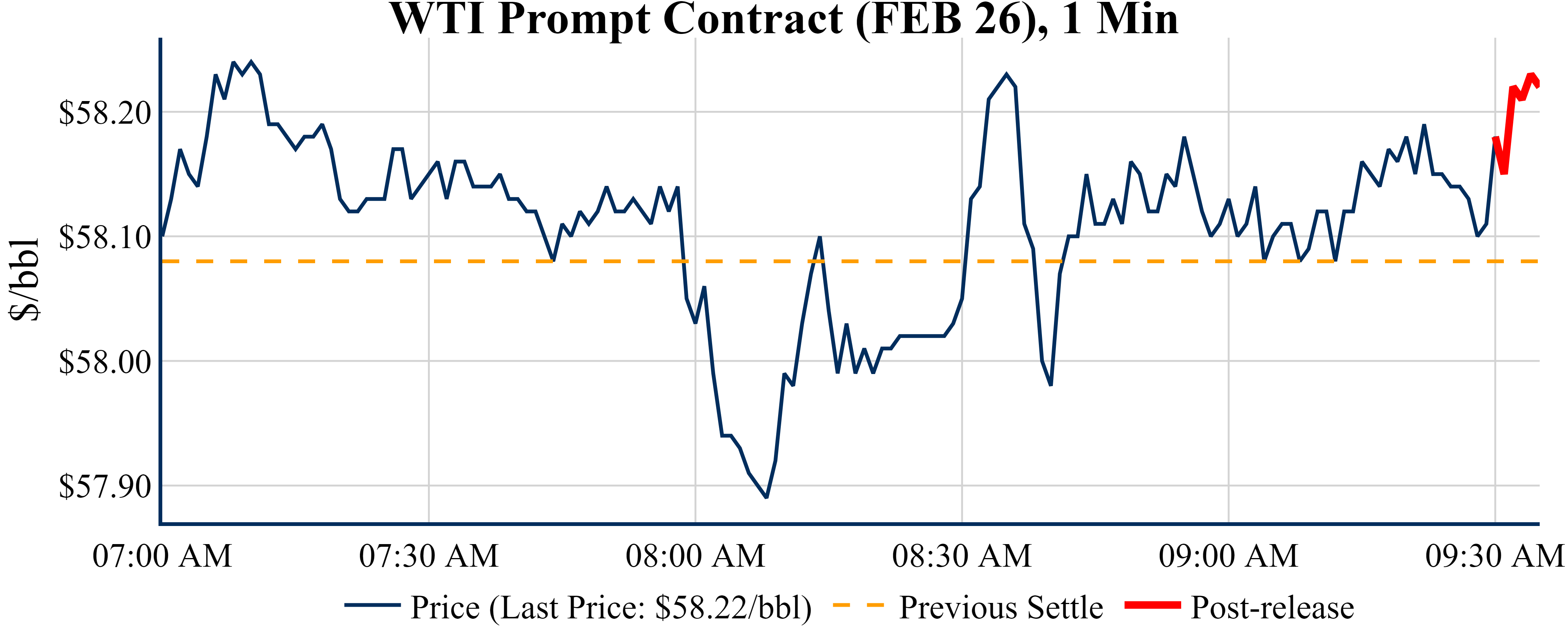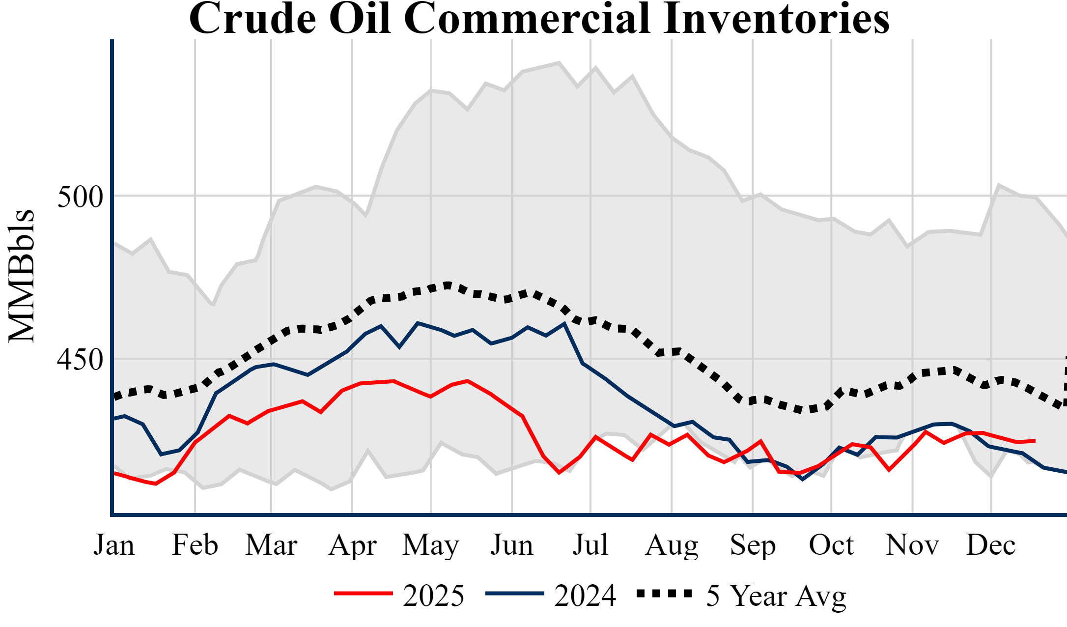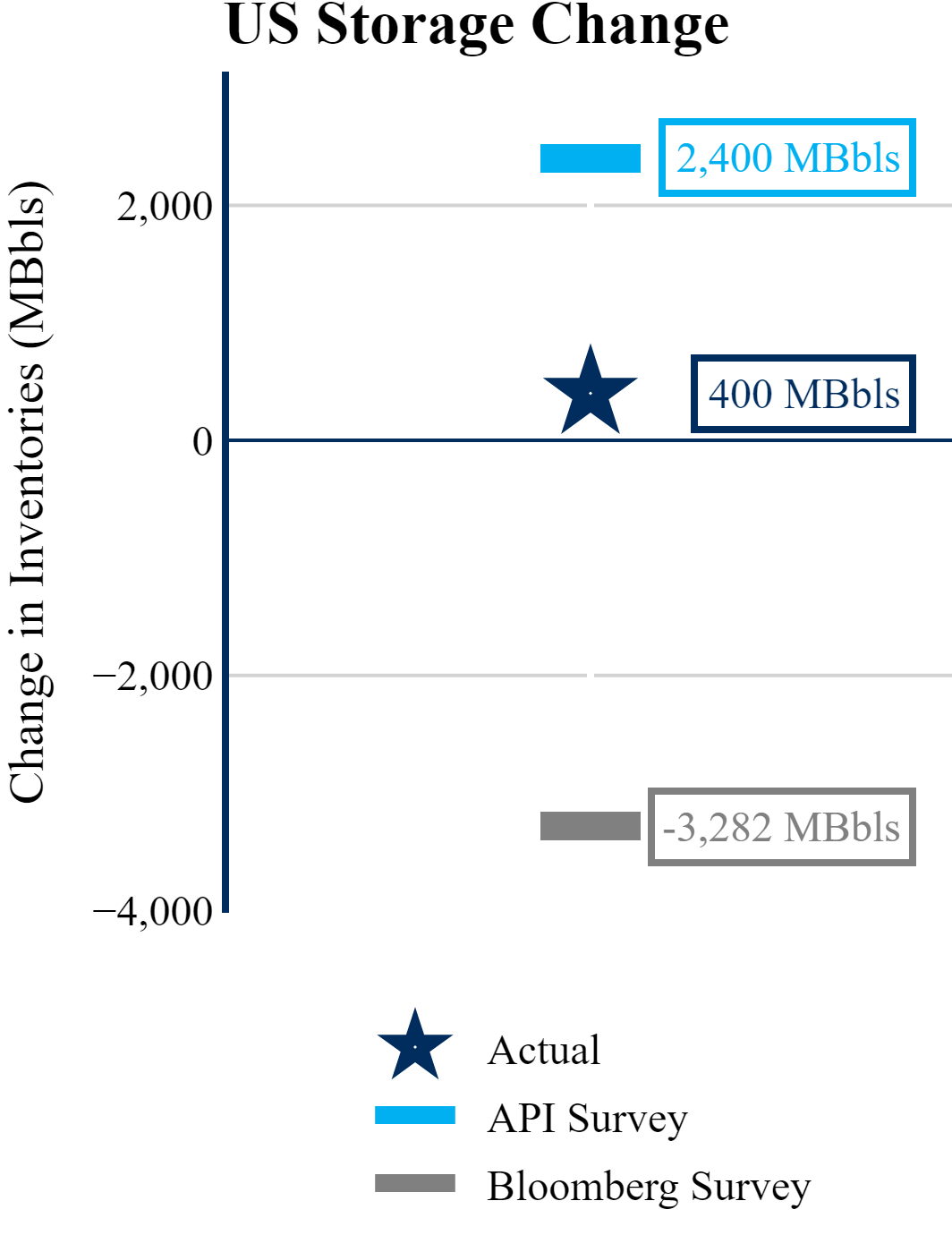 The EIA reported a build of 405 MBbls in U.S. crude-oil inventories. In contrast, the market expected a draw of -3,282 MBbls as reported by Bloomberg. Inventories for the U.S. are now at a surplus of 6.80 MMBbls (1.6%) to last year, and a deficit of 14.80 MMBbls (-3.4%) to the five-year average.