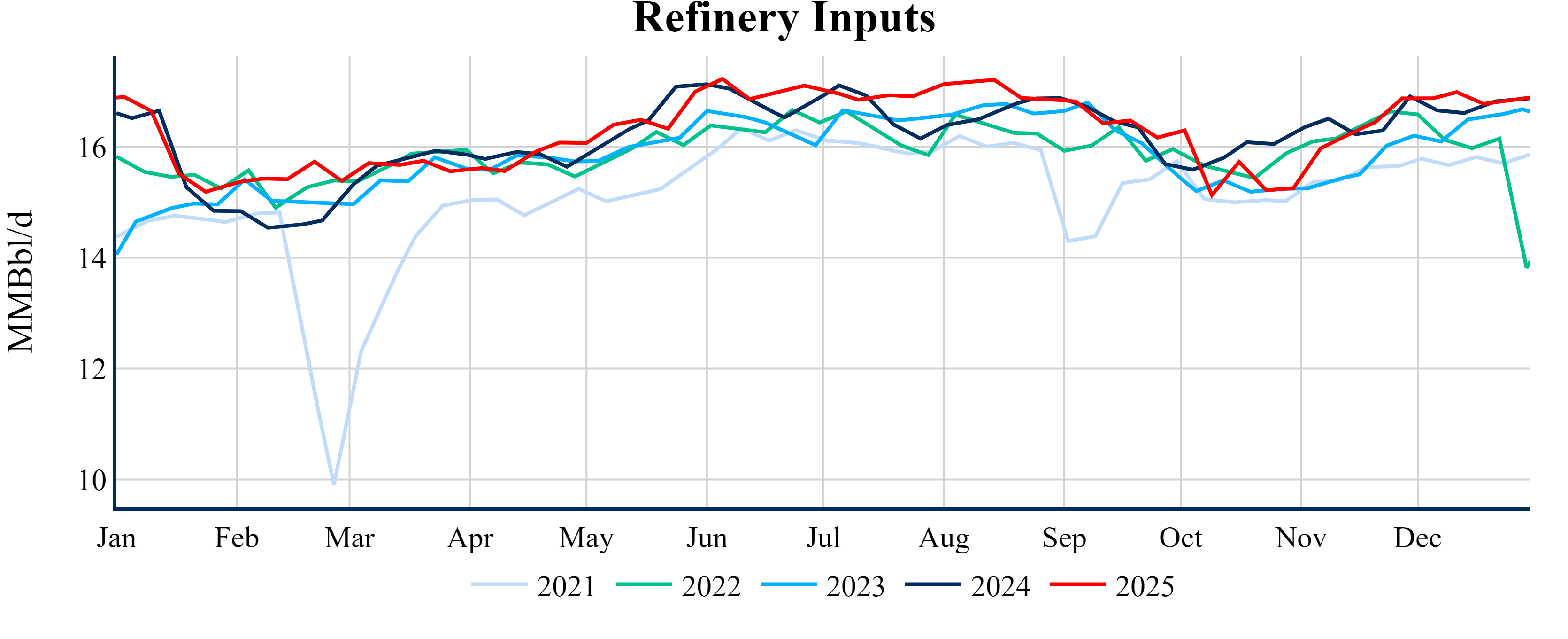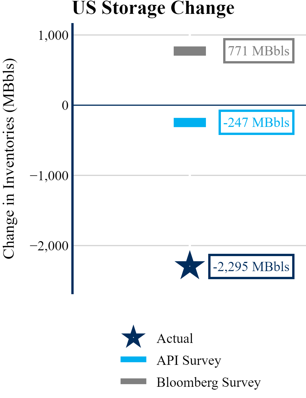 The EIA reported a draw of -2,295 MBbls in U.S. crude-oil inventories. In contrast, the market expected a build of +771 MBbls as reported by Bloomberg. Inventories for the U.S. are now at a deficit of 6.80 MMBbls (-1.6%) to last year, and a deficit of 24.40 MMBbls (-5.6%) to the five-year average.