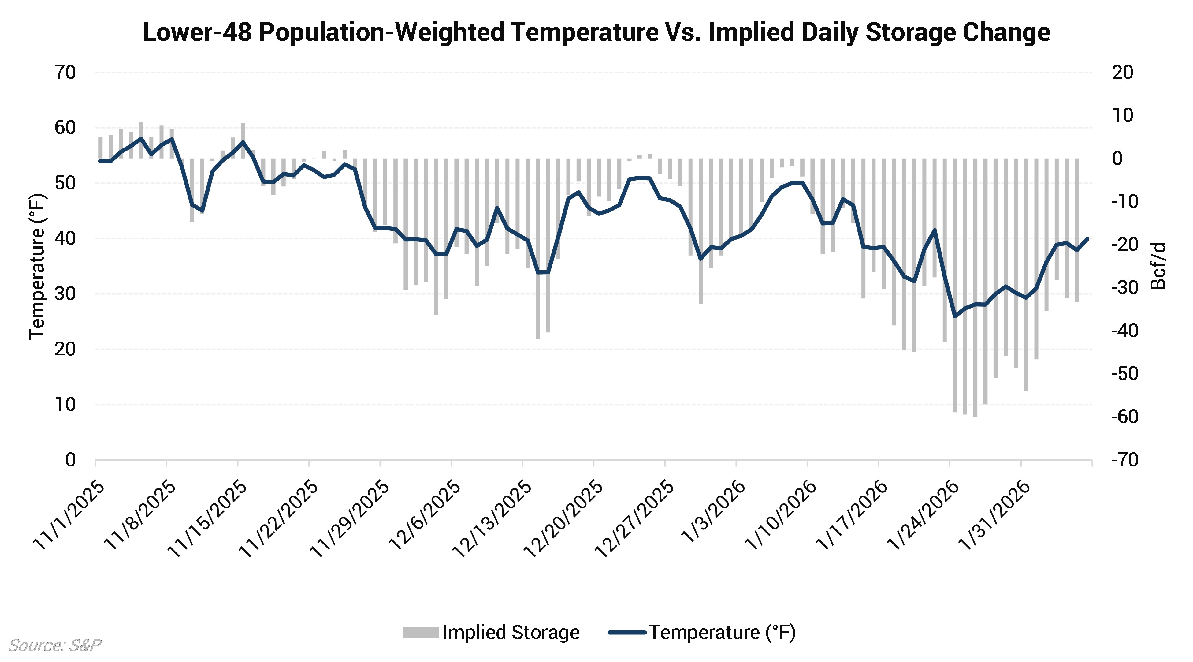 Last week’s winter storm Fern sent natural gas demand higher, supply lower, and resulted in the highest monthly Henry Hub contract settlement since 2022. Most direct impacts from the storm are now behind us, but it has shifted the outlook for gas going forward this year. The storage withdrawal from last week set a new record and has pushed Lower-48 inventories back into a deficit, making it more difficult to build storage this summer in advance of Winter ‘26/’27. This dynamic has led to stronger prices for next summer and winter, although an untimely shift in weather forecasts this week has erased some of those gains.